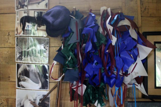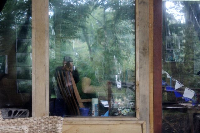 The bunting Queen, Mischa, knitted and wove and cut and punched the bunting in the warm cabin.