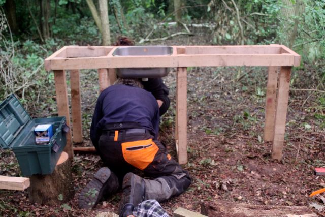 A found sink (useful) rose from the earth, Eloise and Paul working together to Eloise’s design, which included a curved back.