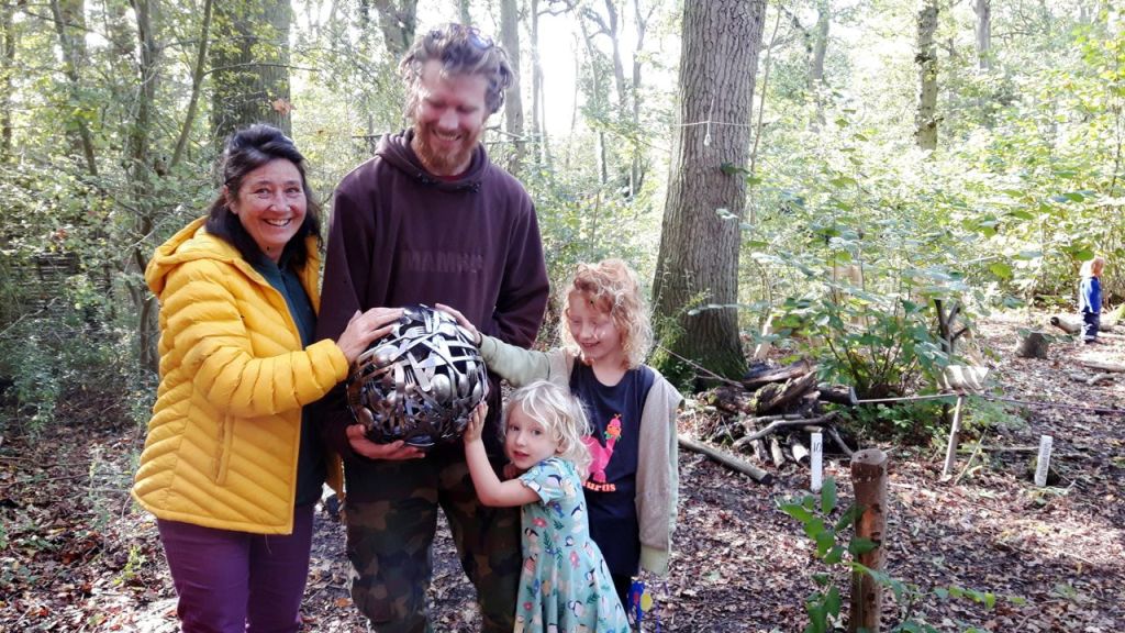 James Nobbs delivered our earth to us. Made out of hundreds of knives, spoons, forks, it was fashioned by James to be 32cm in diameter, which is the scale the earth is for our woodland Solar System.