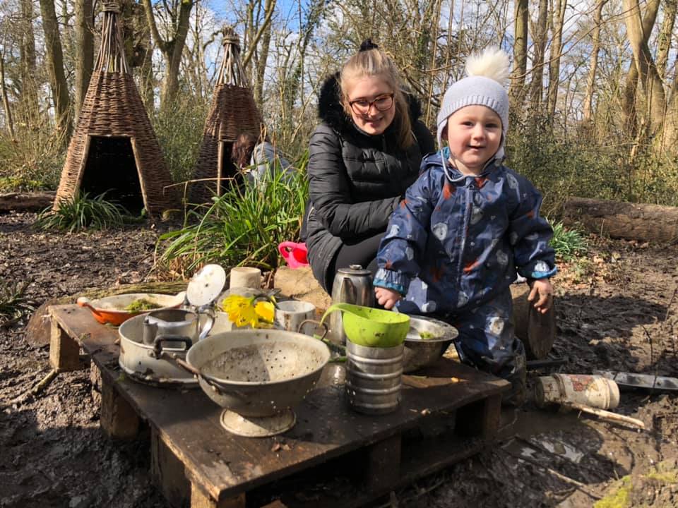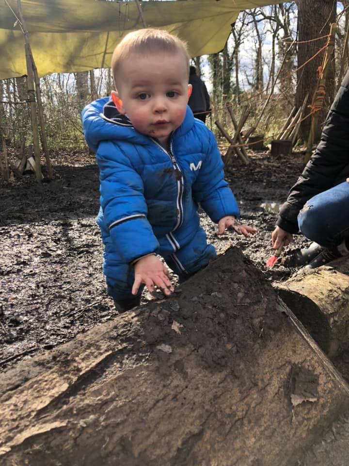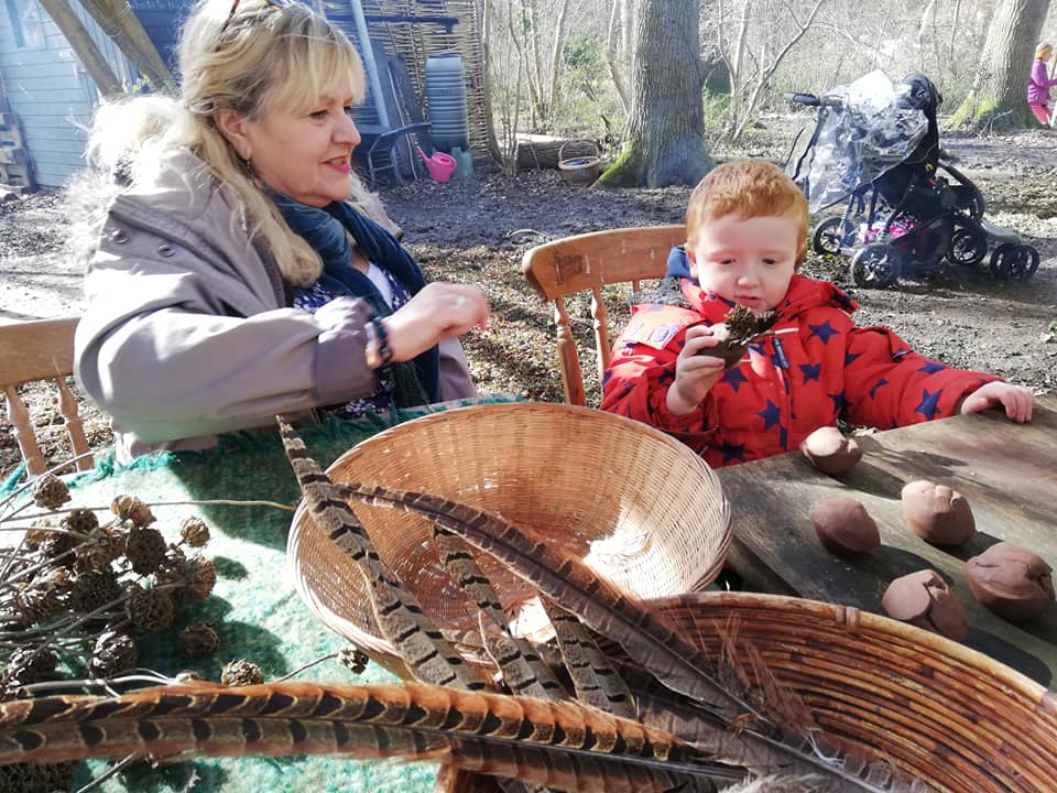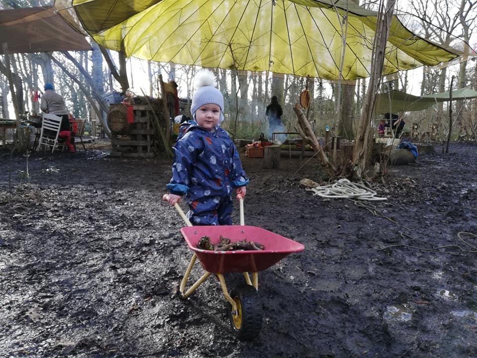 Monday – Parent and Toddler – While week one was a gentle introduction, week 2 was FULL – thank fully with volunteer Alice. On the 2nd week, as the pneumatic drill of the woodpecker resounded around the woods, we rescued meerkats and pandas, invited the frog for tea at the coffee shop, planted pumpkin seeds, met the worms of our wormery, hung about in the yoga sling and shared the sunshine with friends. And just in case we didn’t have enough wood to burn on our first – one pink wheel barrow arrived full of kindling.