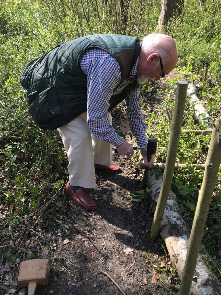 Brian, meanwhile, began the weaving of hazel in a hurdle beside the garden. First he made a few more stakes, (cutting and pointing and hammering the hazel pole into the dry clay earth) before collecting some freshly cut hazel about an inch in diameter and still supple and bendy, and 6-8 feet in length, to weave between the posts.