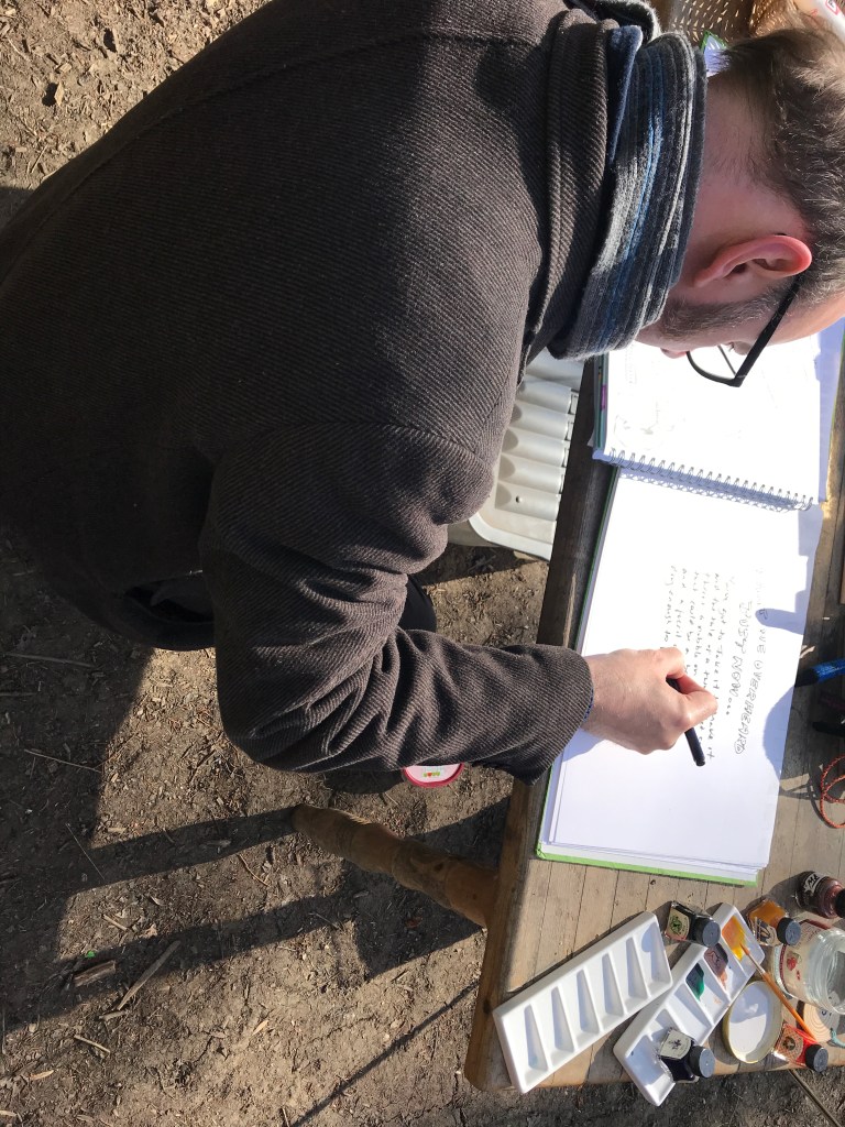 We started our book! Or rather Dean did – writing up his poem in the middle of the page, the page with the imprint of a car wheel on it, as it loitered for a short while on the Beccles Road.