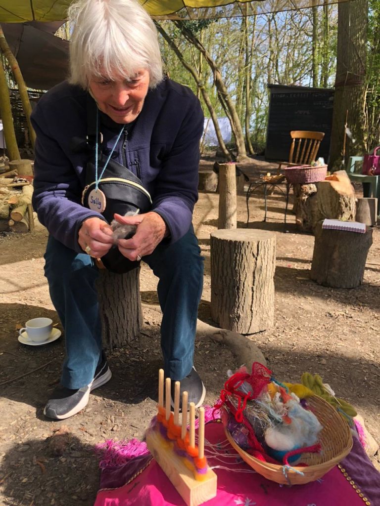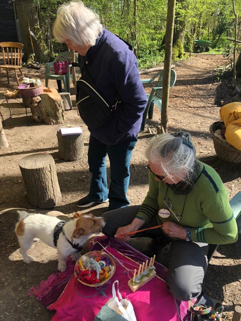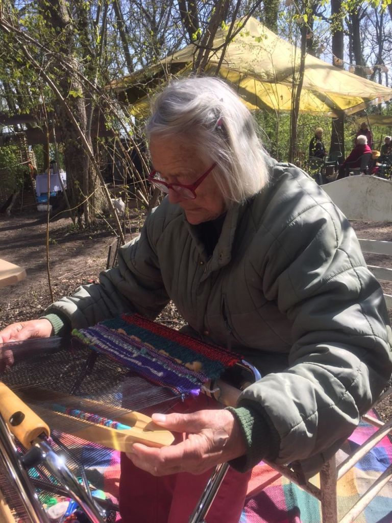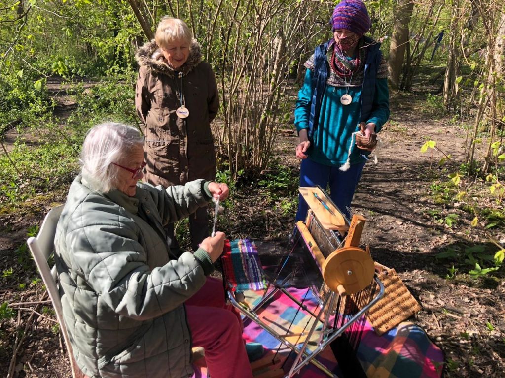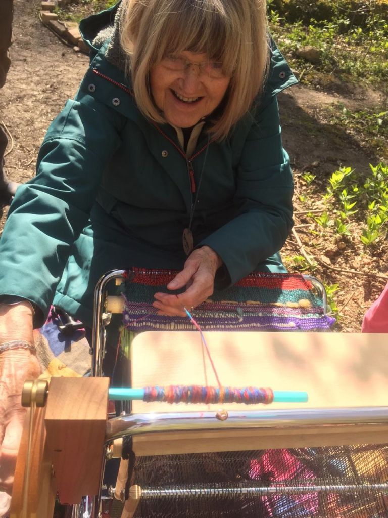 Those who had spun their yarn last week added it to the emerging tapestry with Kally guiding the process. As they became more confident and less fearful of going ‘wrong’ they added more colours.