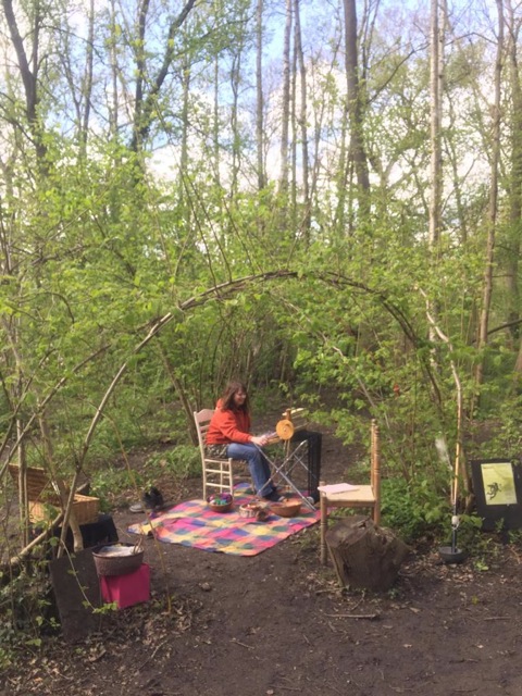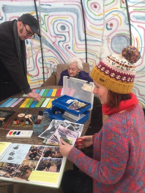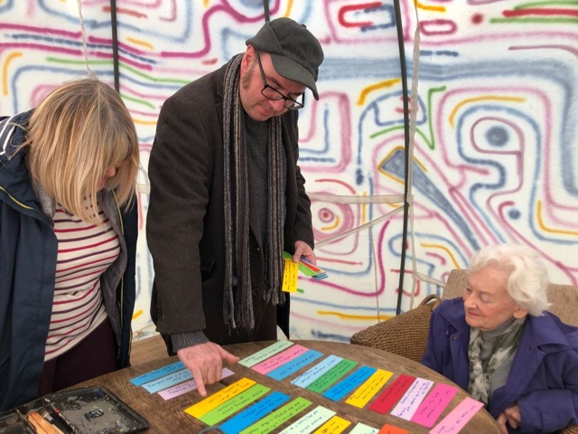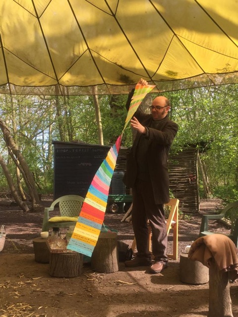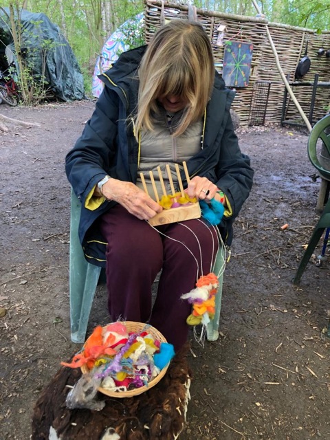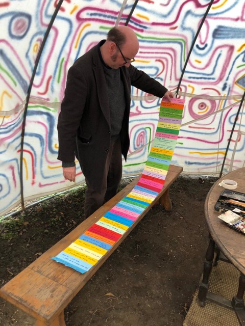 It took over an hour to hear our lockdown stories, and while we were saying them, Dean scribed them down on coloured paper, then disappeared into the Big Bath Bomb Dome. While some were weaving on the loom, B weaving hazel hurdles, magic happened in the BBBD. With the help of Muriel and Jo, Dean wove them together. In front of our eyes, he unfurled the rainbow of them, and read it to us. He made us a poem. It had an ending, but what was it’s title?