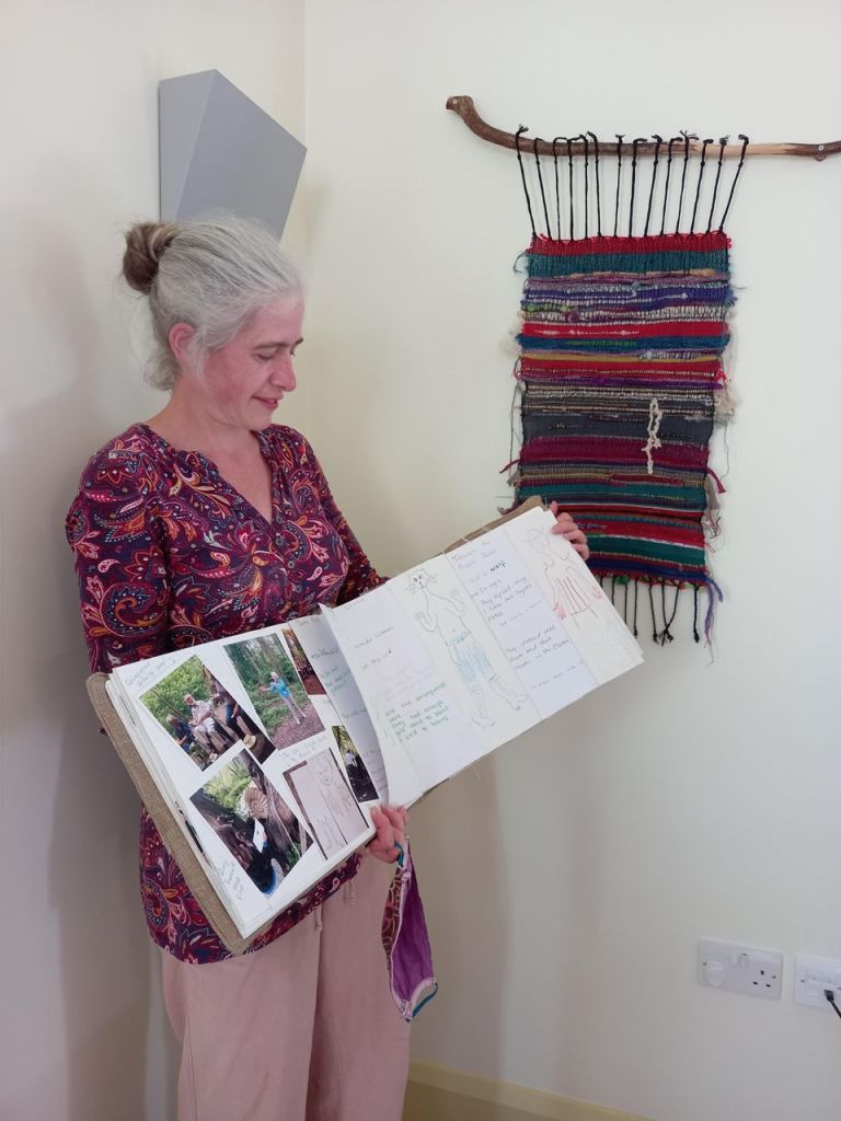 Kally finished off the tapestry in her creative style, hanging it on a hazel branch, and with Kevin chose a good space in the Pear Tree on which to hang it. With some trepidation, we drilled two holes in the immaculate wall, and fixed the tapestry to it.