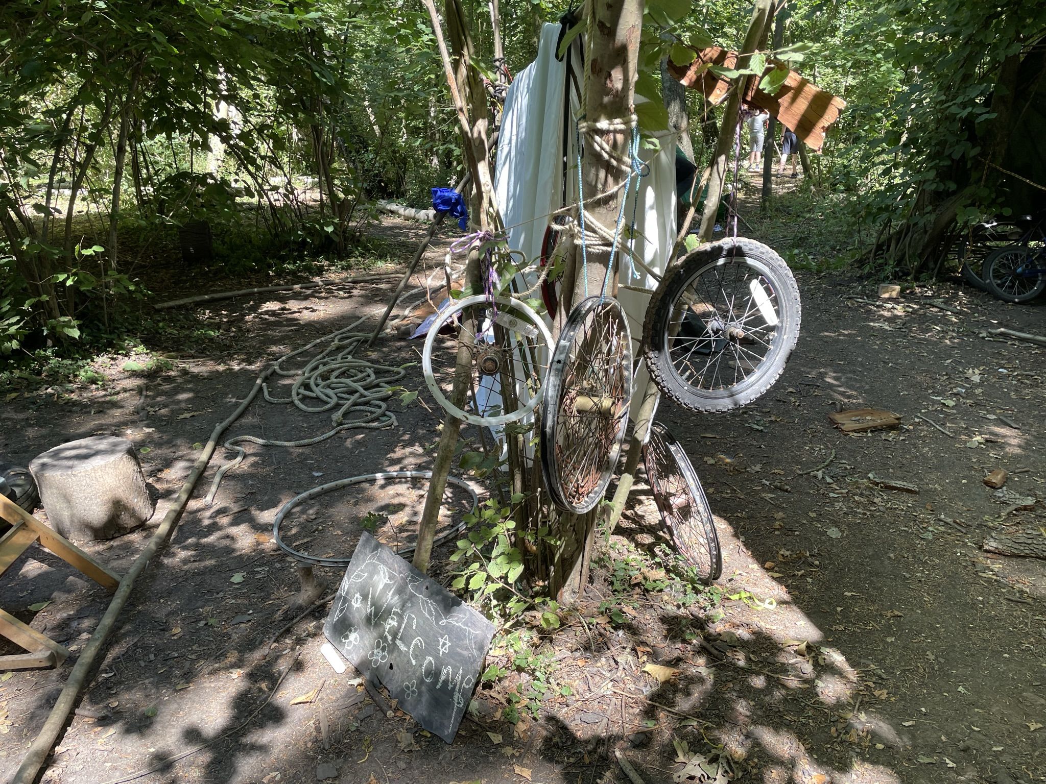 With luck also washed up was some dried grass, old mans beard/Travellers joy and a fire flint, so we could make fire to dry us off. We had music, including a ships bugle, provided by Thalia and Del, who also bought treasure, old coins, (some so old they were part of our pasts, like a threepenny bit). We ate fruit (fighting off a few wasps also interested), drank lots of water. Finally at the end, the bikes came out, as we dismantled our shelters and bought the camp back to earth.