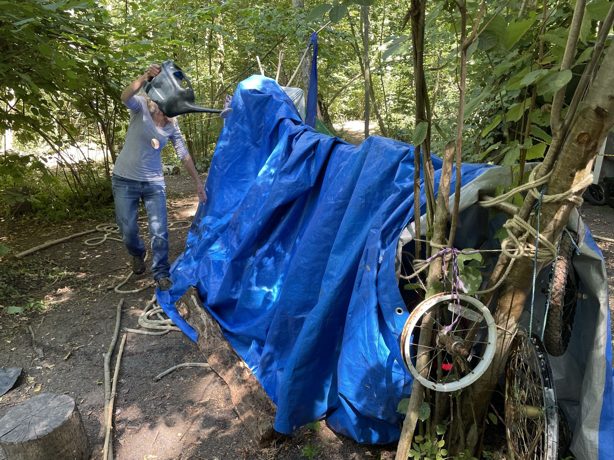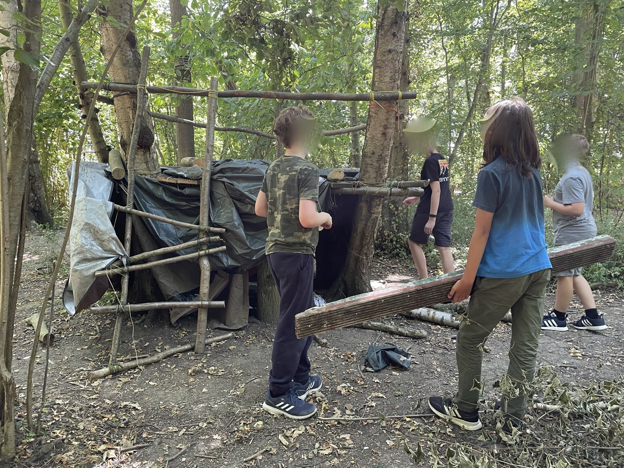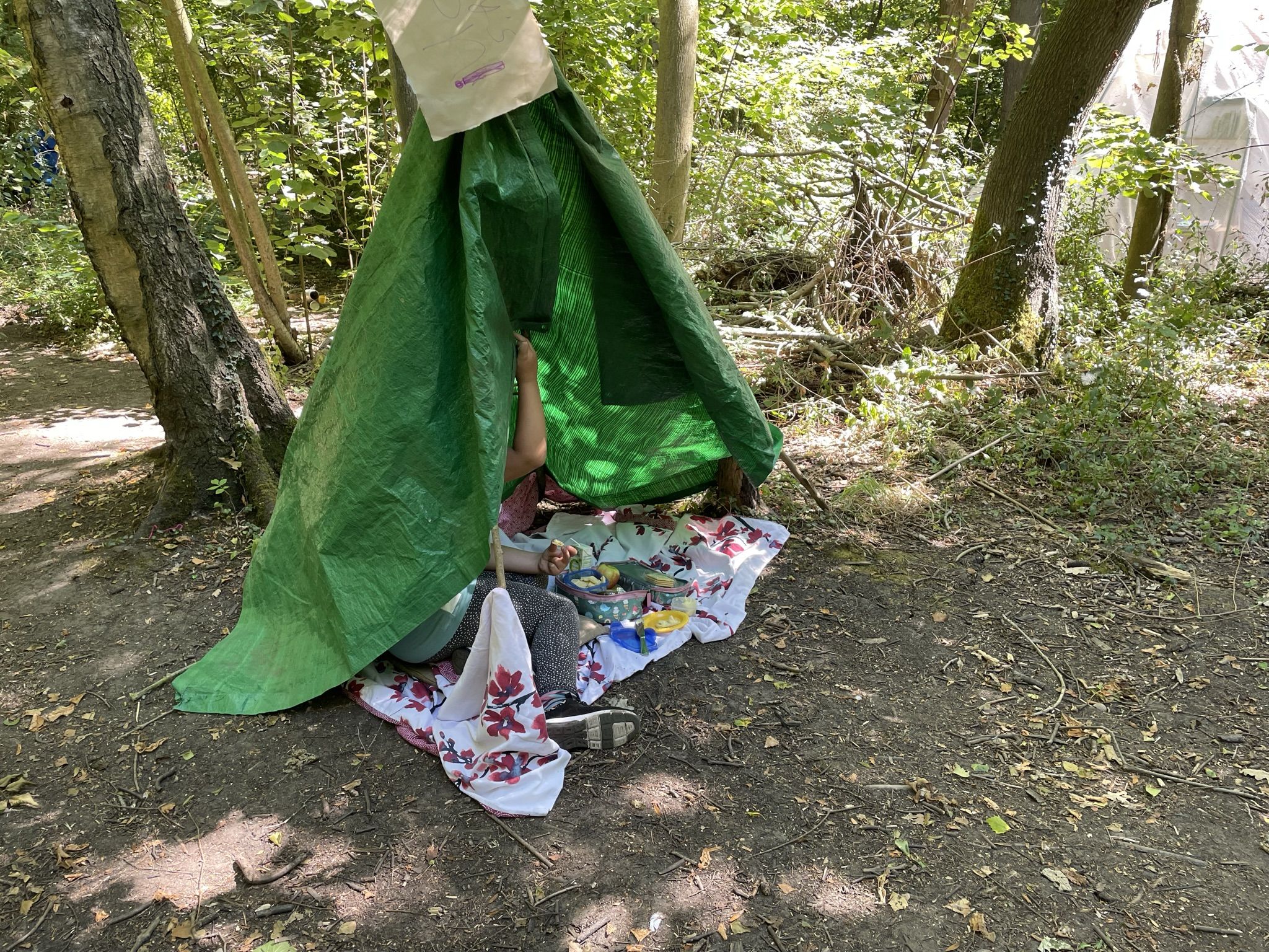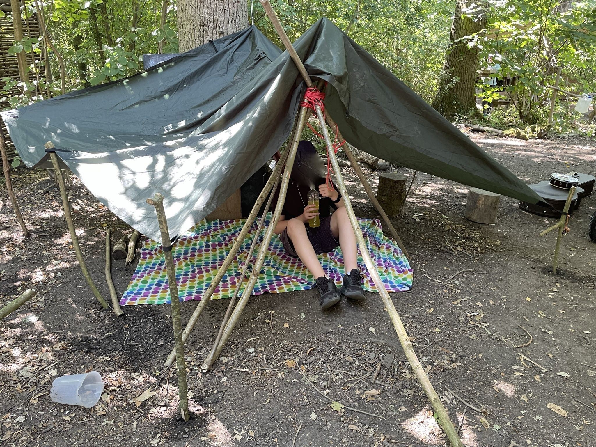 Led by Eloise, we had a mission: to build a boat. Suddenly a storm arrived from the east necessitating us to abandon the boat and swim to the island. Here we found various useful things washed up, like string, Y sticks, and tarps, enabling us to build our own shelters, plant seeds for a future apple tree, provide cushions for lounging on, write messages in a bottle. Later our shelters were tested for water proofing, when the 2.30 storm arrived. Most proved to be secure, although Eloise found herself a bit drenched.