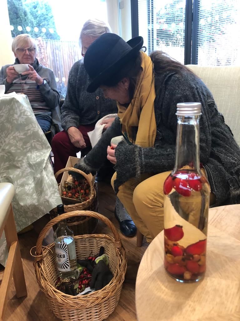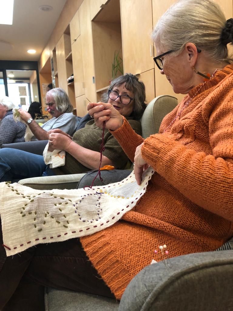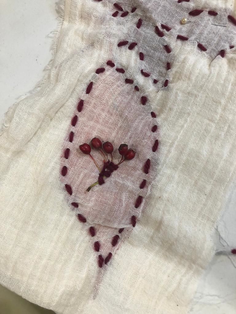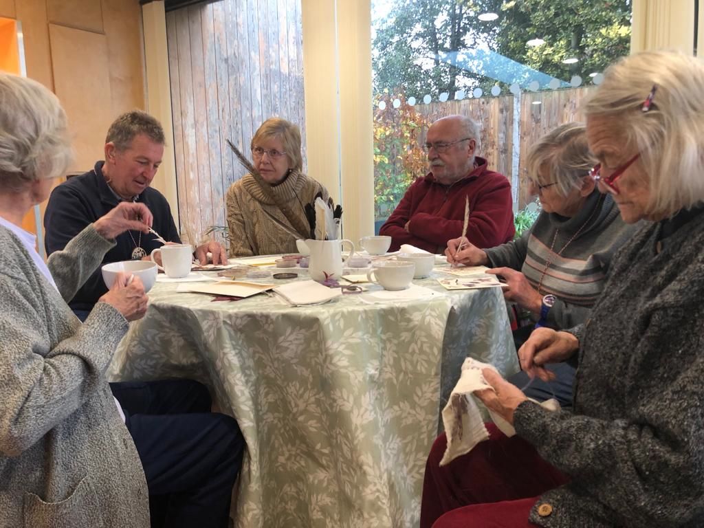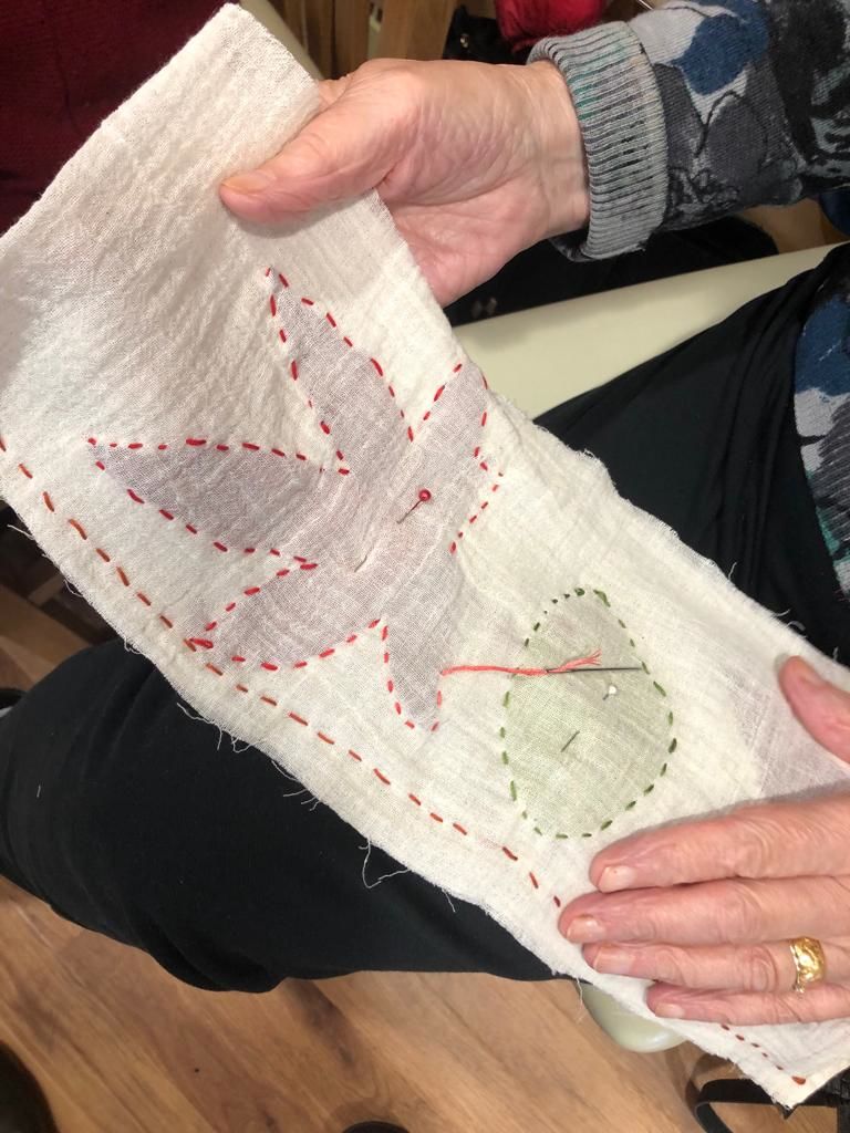 We were welcomed at the Pear Tree once again, as rain slanted down outside. Accommodating the eye testing, cooking for one, and ear testing, we enjoyed a mediating 15 minutes of silence, while we sowed stain glass muslins (leaves in muslin) thanks to Leslie who inspired us with the idea. One had never sown before. Some painted greeting cards using our natural inks, or rather they ticked the paper with a feather.