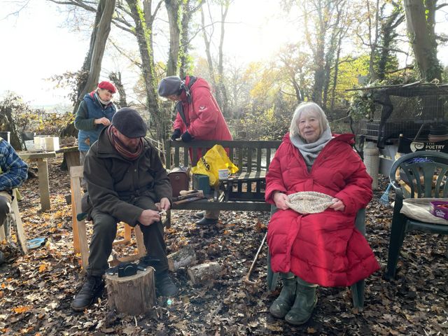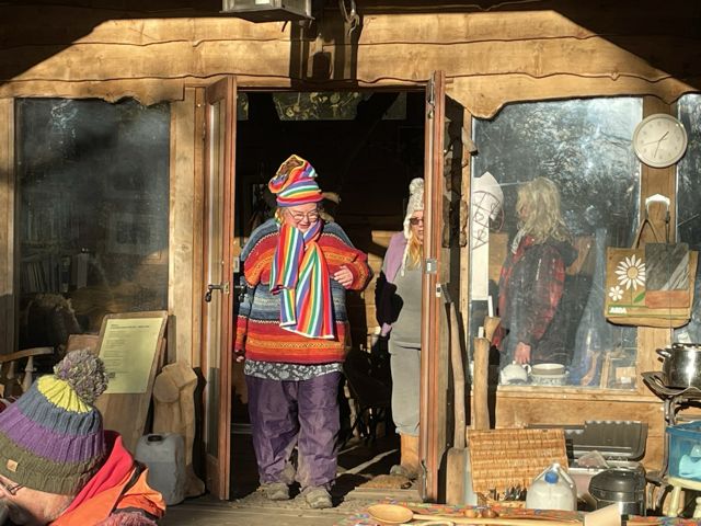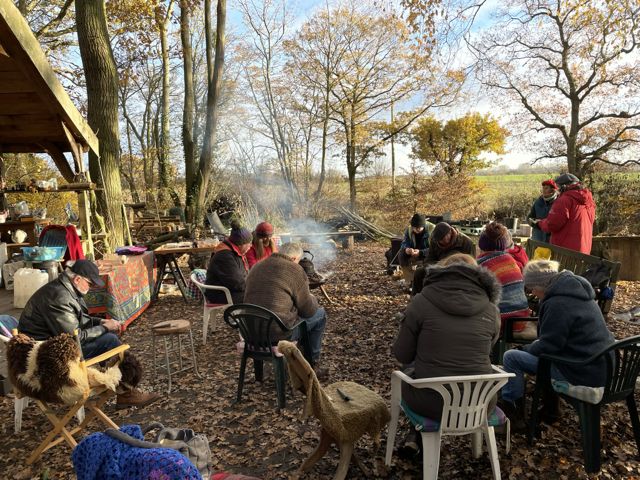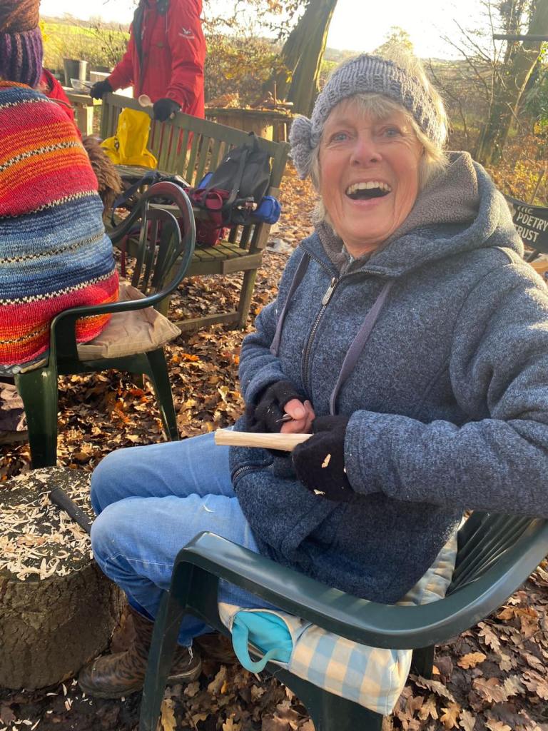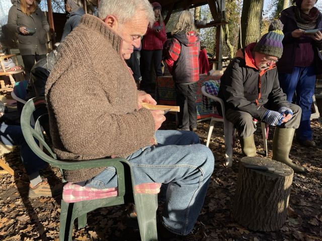 Jason Parr came with his pre-cut spoons, axe cut, silver birch, to teach us spoon carving. He came with a collection of spoons he’d made earlier to inspire us: A back of an old chair, large spoon from a Selfish Sycamore, a sexy box spoon, and a brown oak spoon. So it was, on this freezing cold December day, we sat around a warm fire, and learned from Jason the art of spoon carving. How to hold the knife, sometimes holding firm the knife and moving the spoon. Patience and meditation were the skills we also discovered, along with the gentle art of conversation.