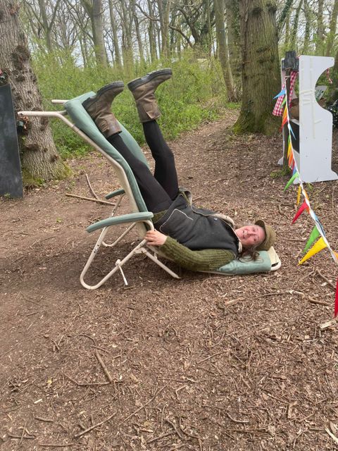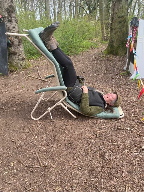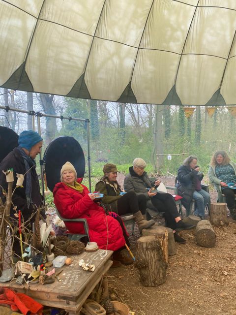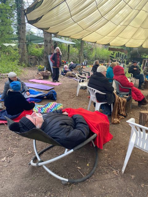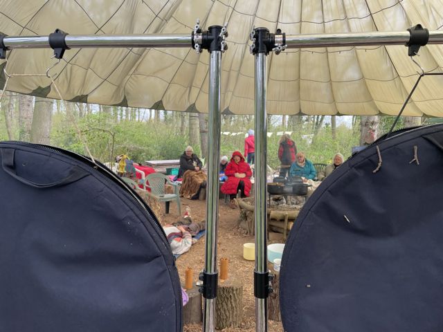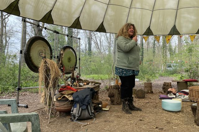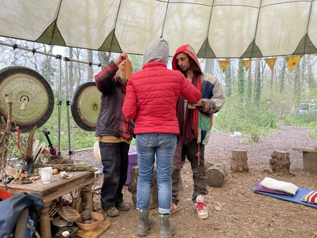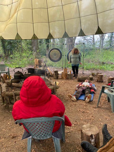There was a cold east wind, but we were protected in the woods, so took our place around the fire, laying down or sitting blanketed up on our chairs. So Tracy began her introduction and with our eyes closed we submerged into the sound of the sun and earth gongs and crystal bowls. Even the roosters kept quiet for a while.