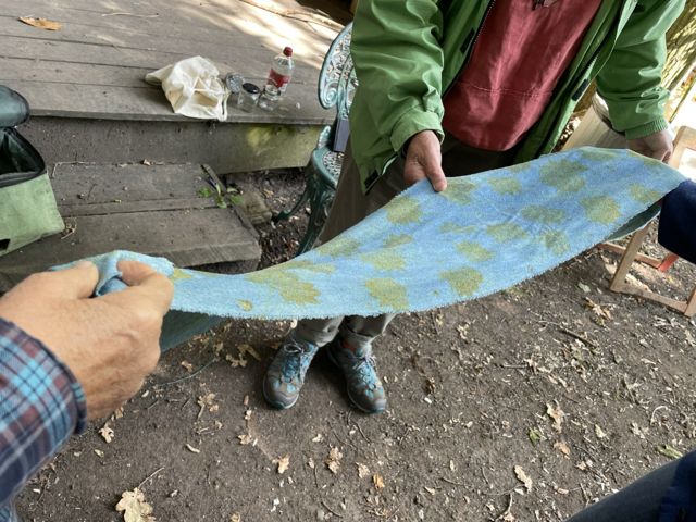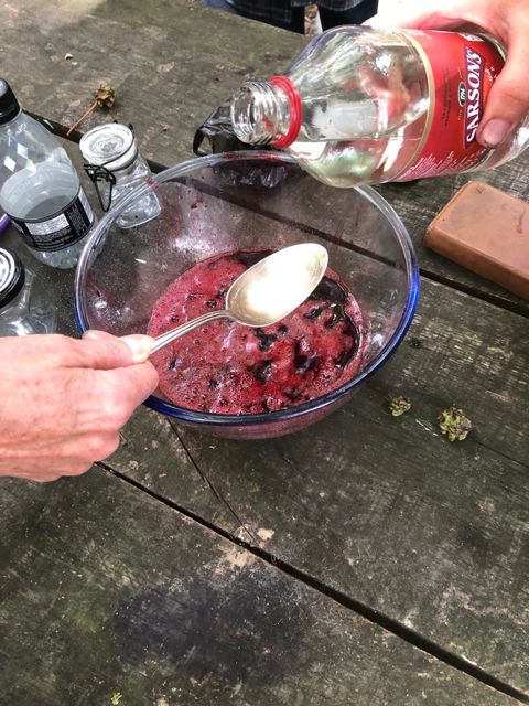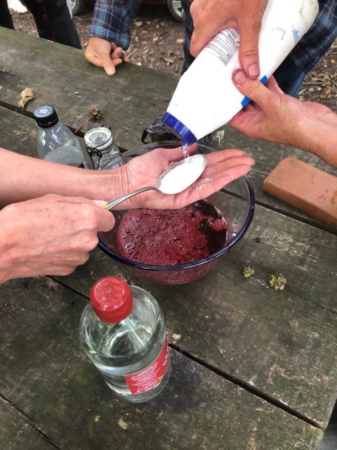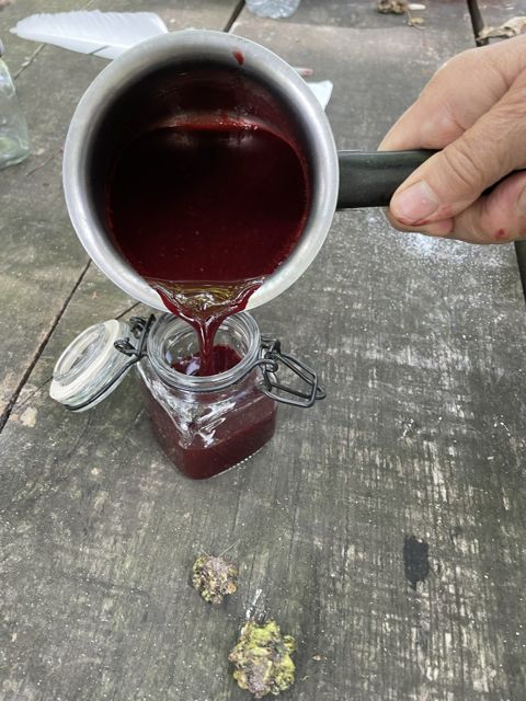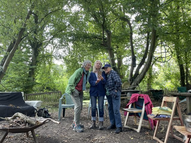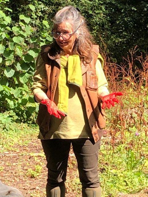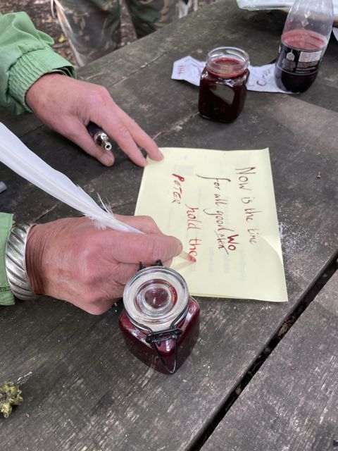 Making blackberry ink, Chris cutting the goose quills, Diana showing her Ragwort dyed fabric, Virginia inspiring us with stories from Barsham Faire.
