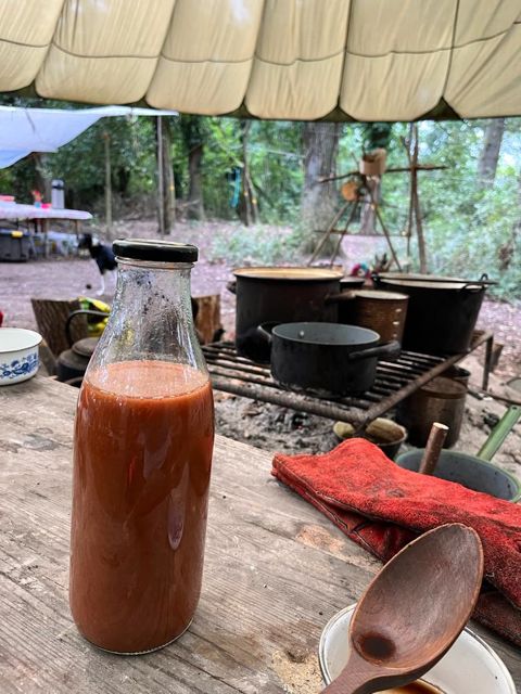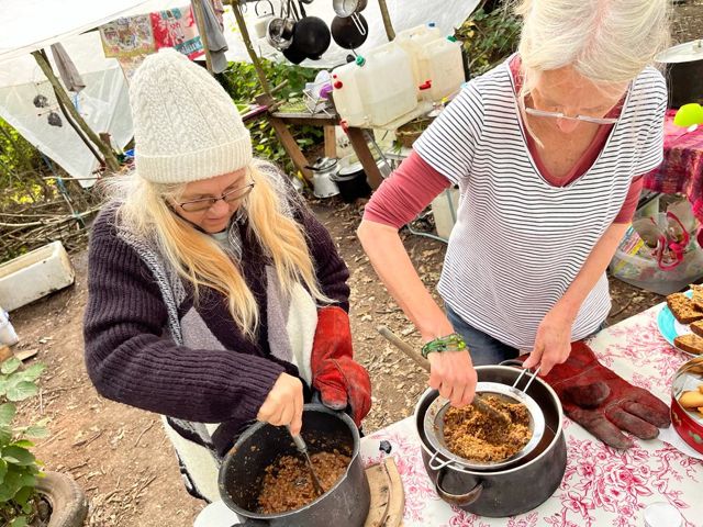 We made Haw ketchup, Lesley & Diana pressing cooked haws through a fine sieve, and slow cooked chips. Bit bitter – Nicky forgot to add the sugar! But the flesh was quite tasty! We ate chips from newspaper cones.