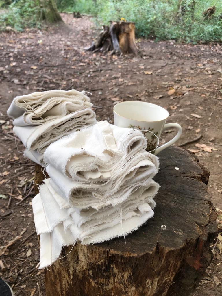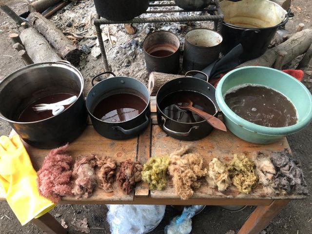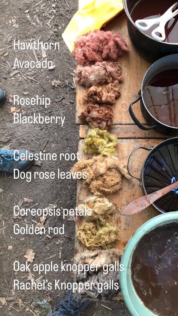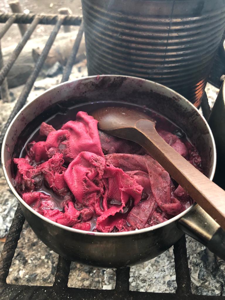 Kally began her magic with the dyes, cooking nicely over the fire. Virginia helped her retrieve the matter, which she called ‘entrails’ out to dry on the line. Armoral, Andrew, Virginia and Yvonne had a ripping time, tearing up old sheets to be mordented and dyed next week.