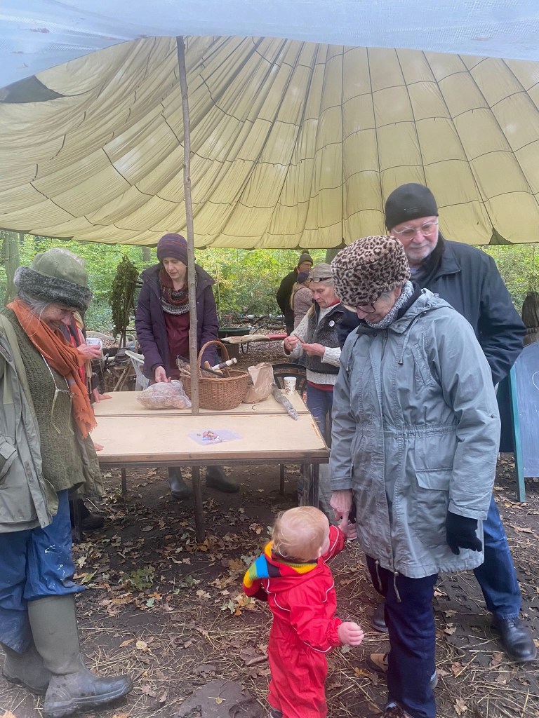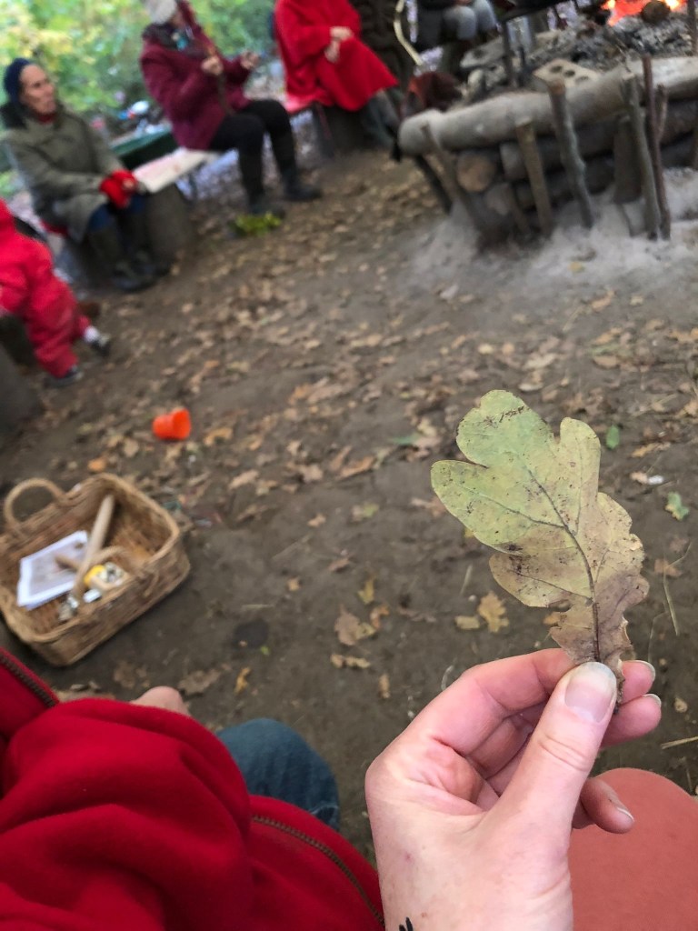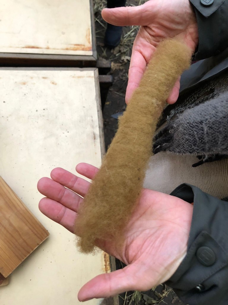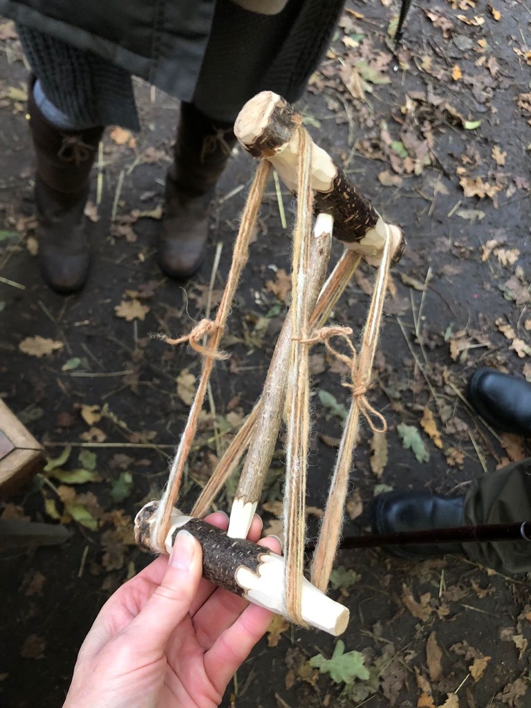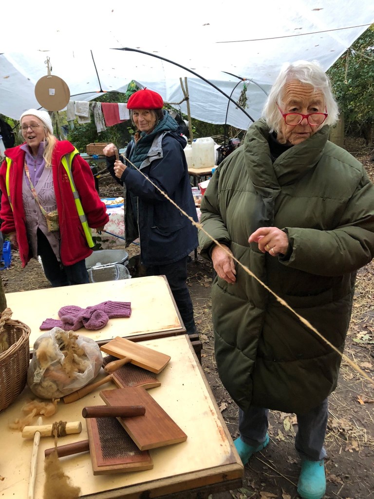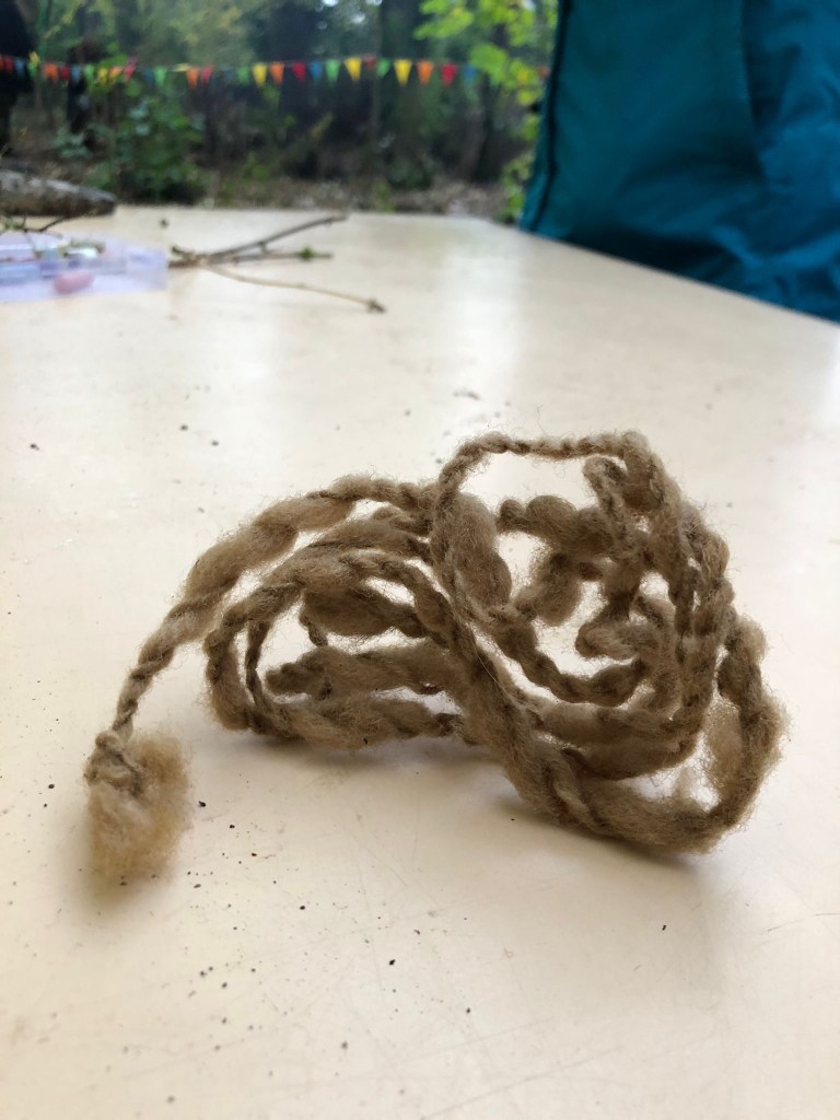 Kally amazed us with spinning yarn using a potato and a chopstick to create a drop spindle. We hand carded some of the fleece we had naturally dyed into rolags, had a go spinning our rolags using a twig spinner and a Mayan style paddle spindle made from hazel rod. Then we met niddy noddy who we wound yarn around.