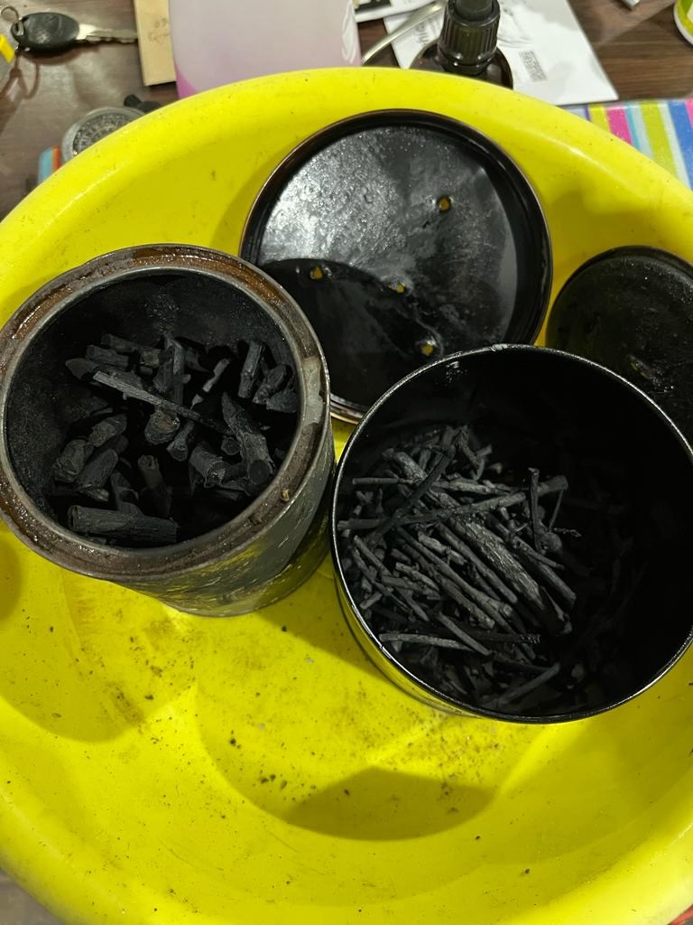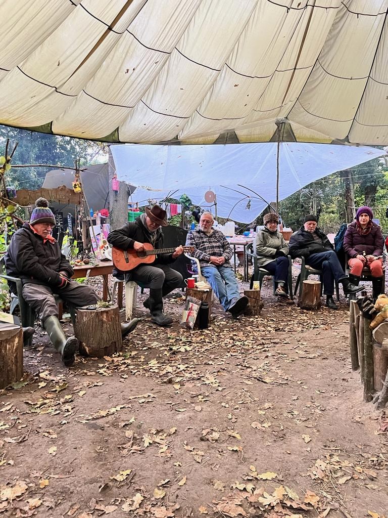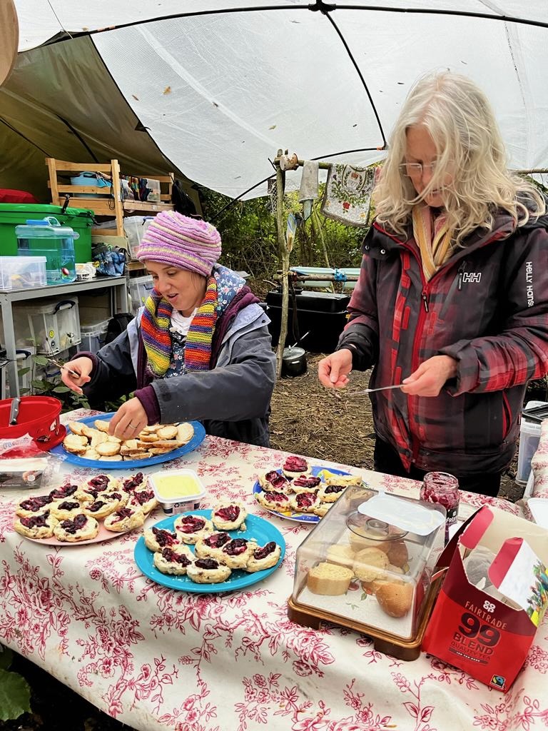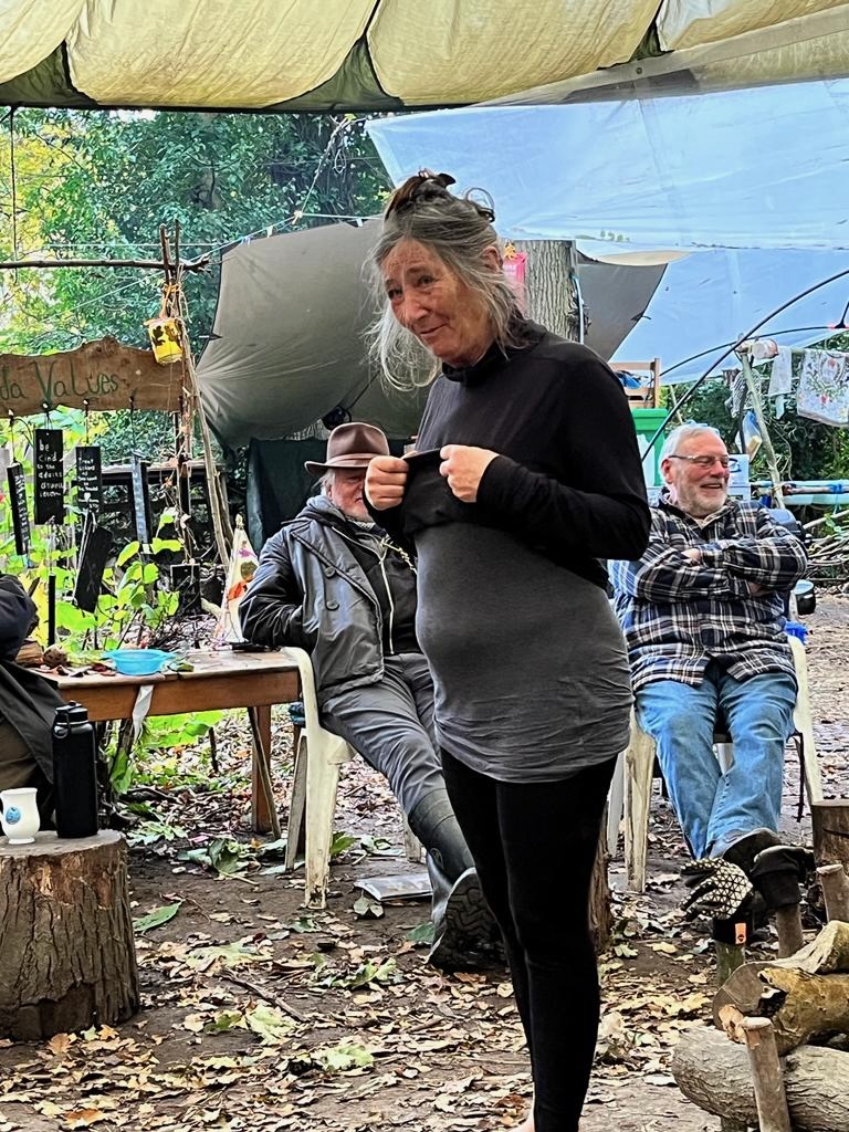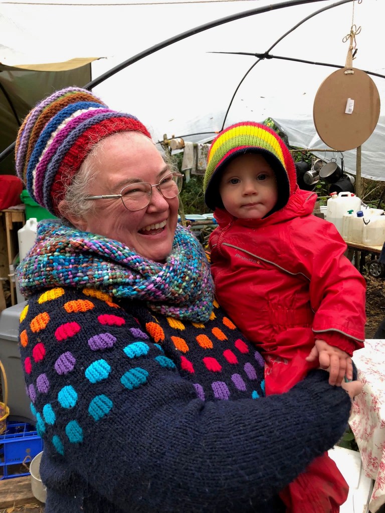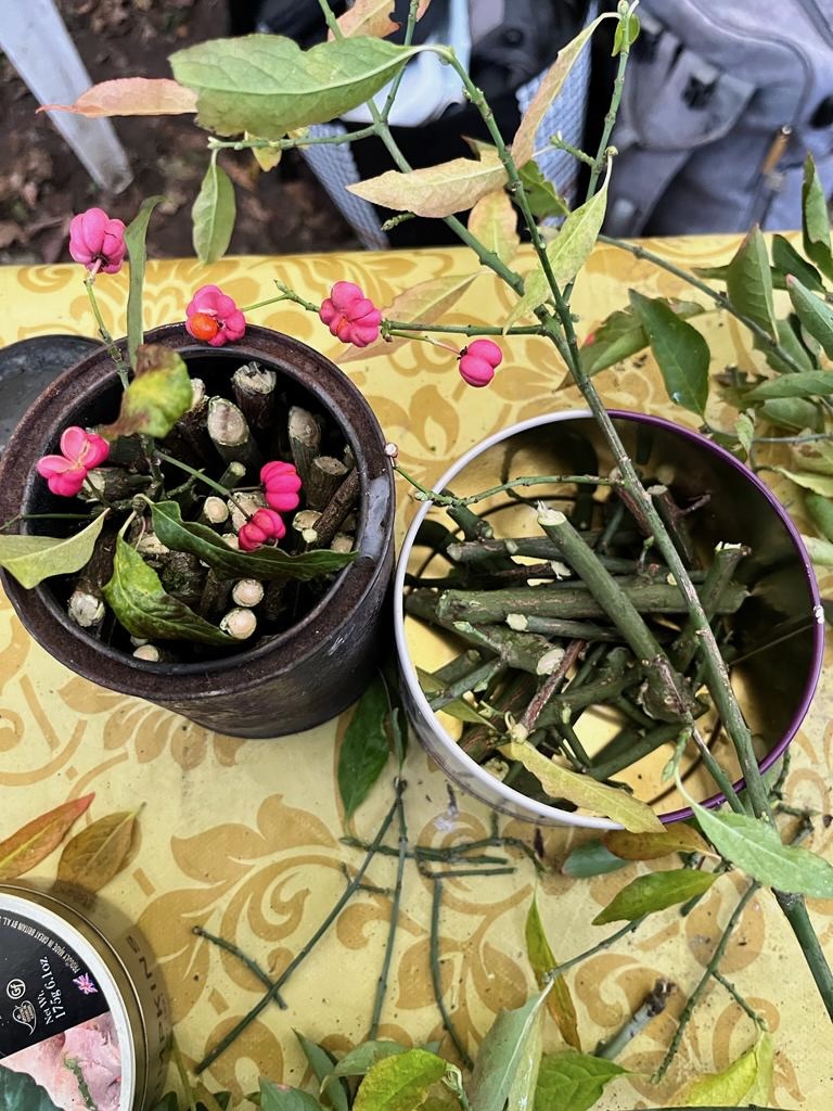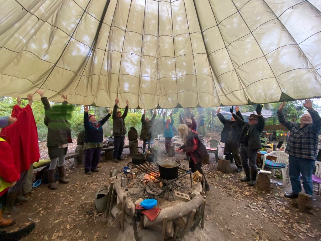 Kally amazed us with spinning yarn using a potato and a chopstick to create a drop spindle. We hand carded some of the fleece we had naturally dyed into rolags, had a go spinning our rolags using a twig spinner and a Mayan style paddle spindle made from hazel rod. Then we met niddy noddy who we wound yarn around.