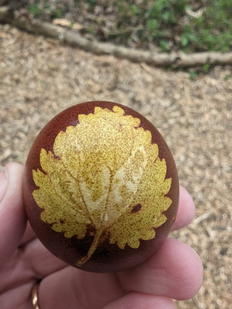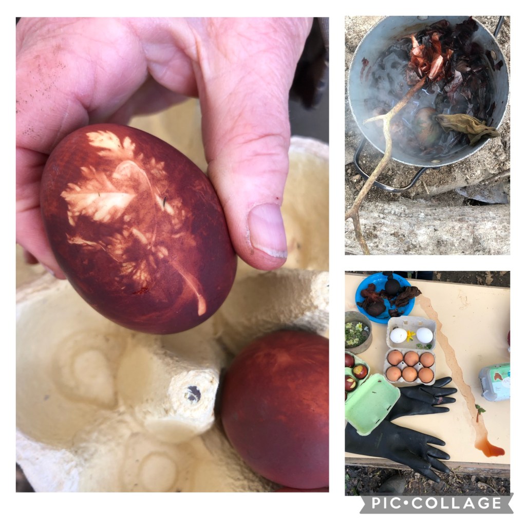Meanwhile on the fire, Kally was cooking up the onion skins, and some dyed eggs with wild flowers and leaves around them, held tightly within a stocking. The results were beautiful.