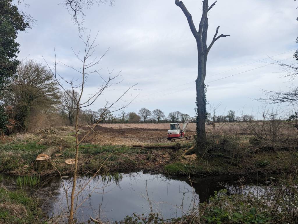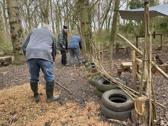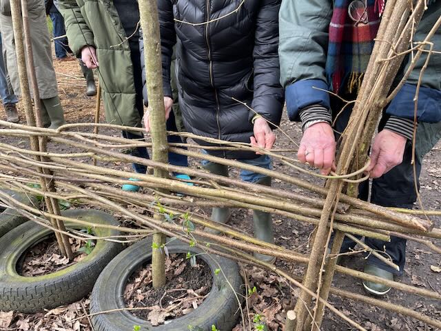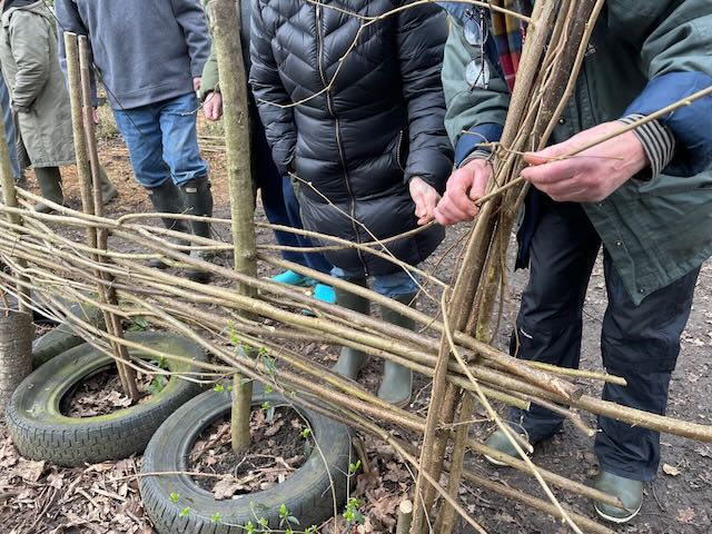 With recently cut bendy hazel stems, some wove around the stakes bounding the tool area.