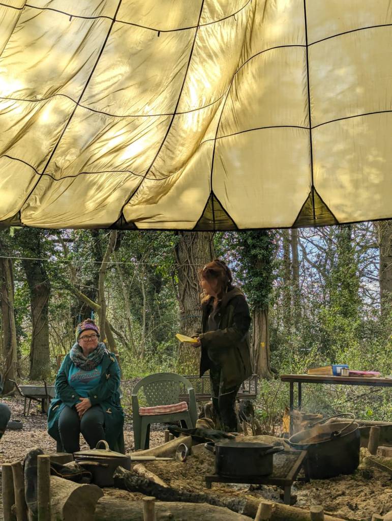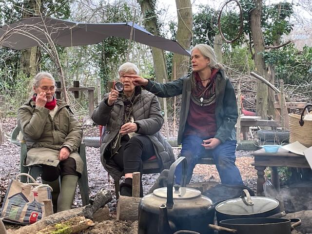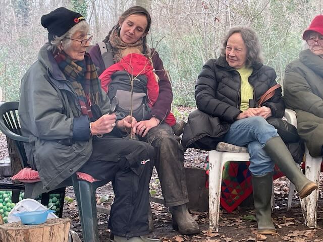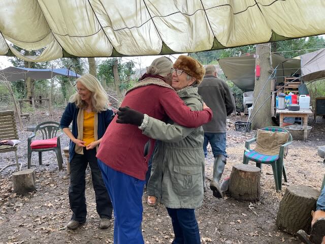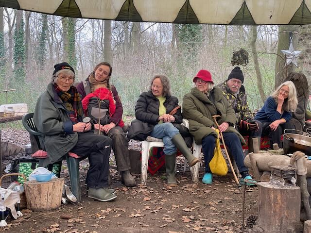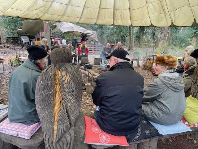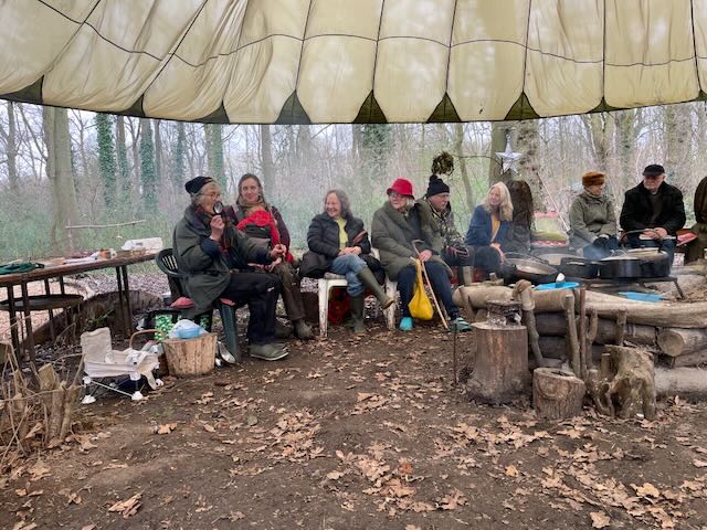 Hurrah! we are back in the woods – a rich and warm and fabulous community of Vintage Elders collected, walking up the golden path of woodchip to the fire circle. Here we hugged, exchanged, ate soup, and finally gathered for our first circle of the year.