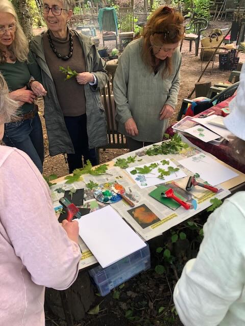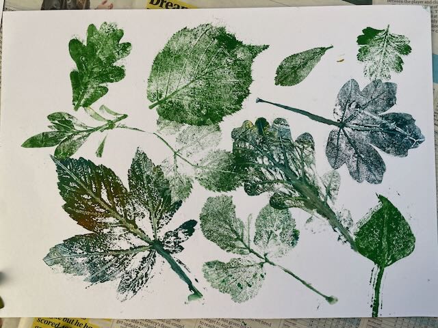 Along the hedge on the western side of the wood, we gathered a leaf from each hedgerow plant, and back at base, with Kally’s paints and rollers, we pressed an image, and so created our hedgerow survey.