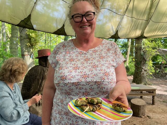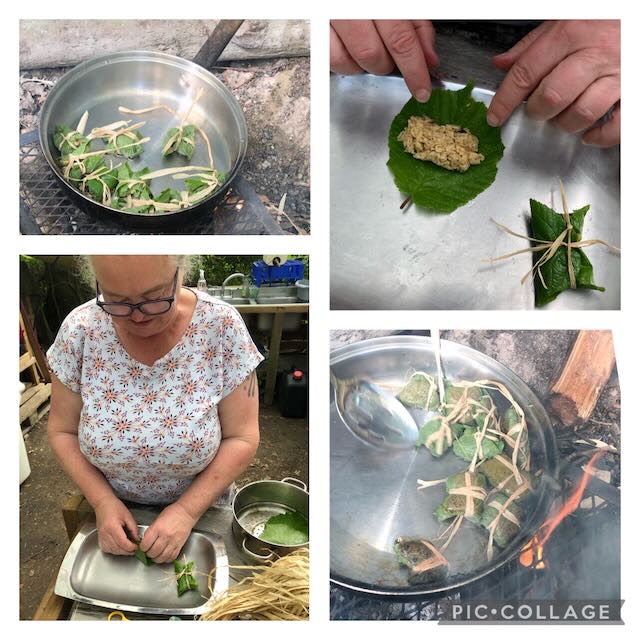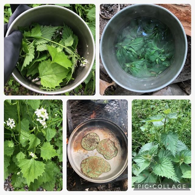 To cap off the day, Nicky prepared little parcels of flapjack in a hazel leaf and Kally prepared some Garlic Mustard, Nettle Belini’s. Yum. Just missing the salmon or bacon accompaniment.