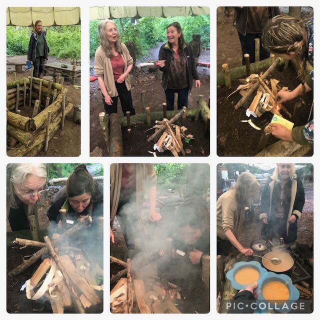 We completed the creation of the new fire pit begun by the Wednesday tribe, by filling with soil, cutting fresh stakes and banging them in, before we had a ritual lighting of the first fire. The pit was much admired by Roy and C.