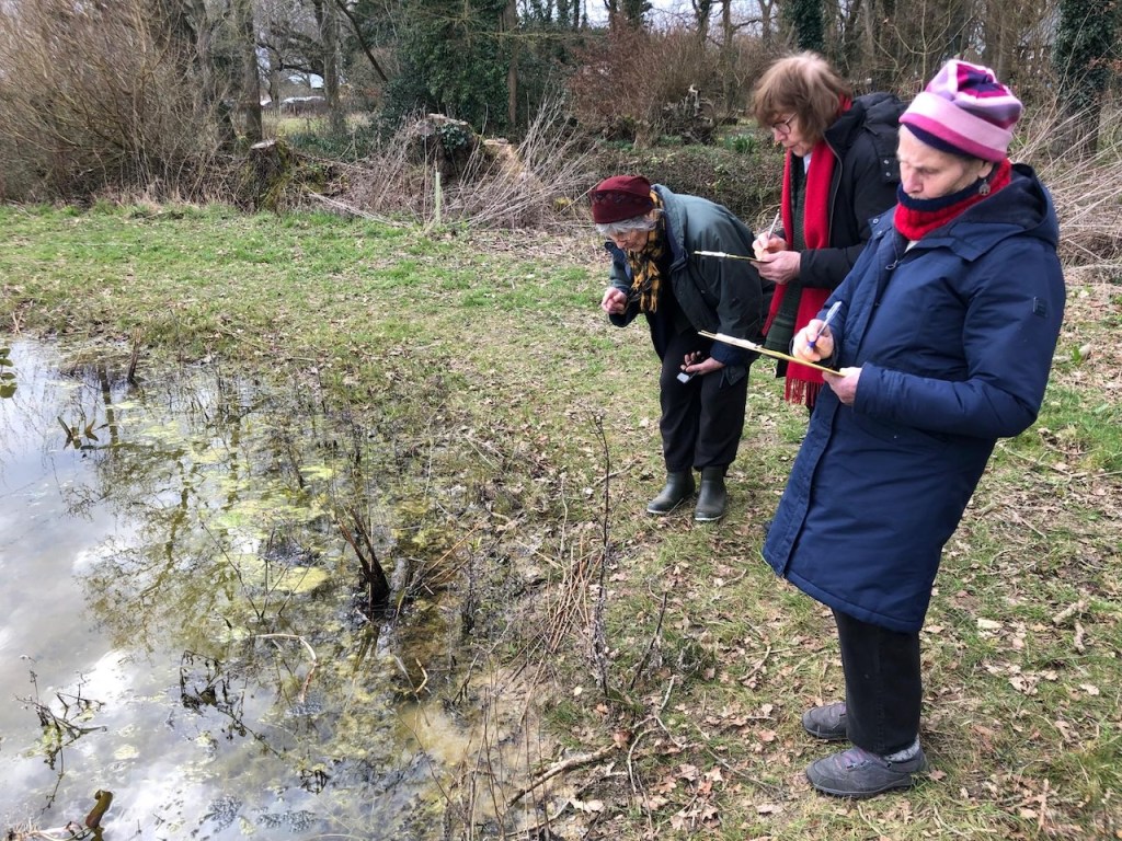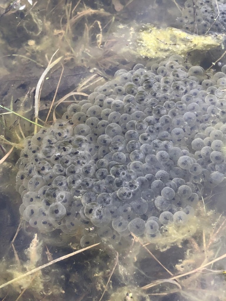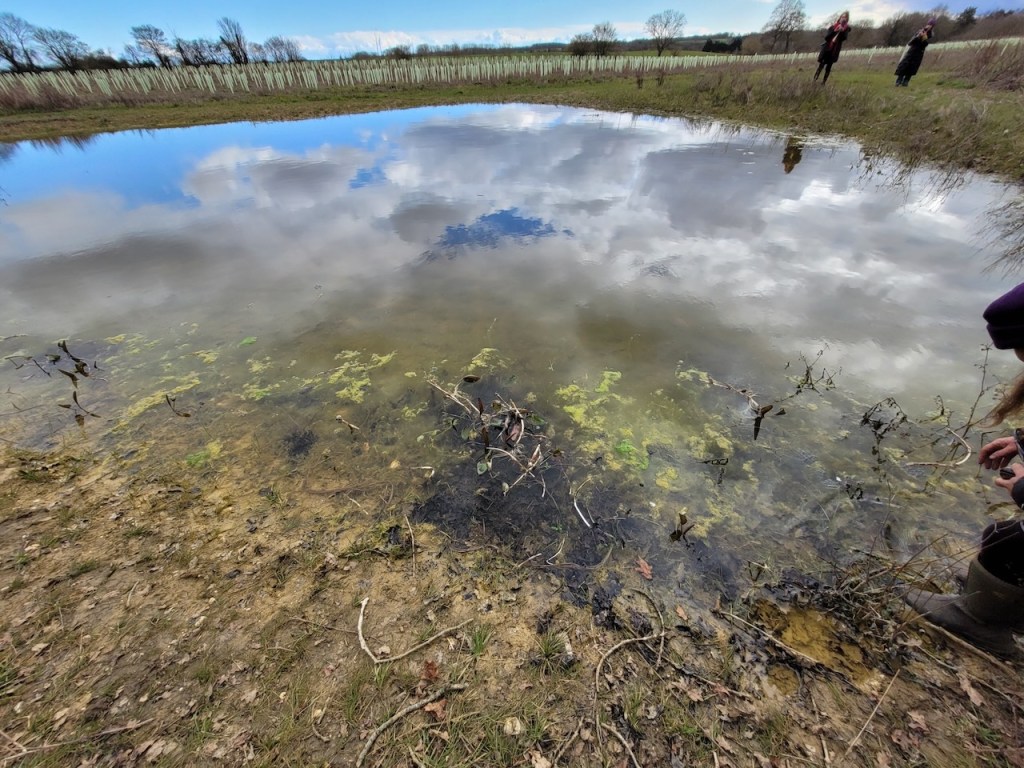 Meanwhile, Dr Andrew and Esther Paige, observed that there were 3 clumps of frogspawn in a 1 year old pond, clay base, settled in the shallow base. Threats? herons? Ducks, other wildlife? Evidence of Muntjac deer hoof prints.