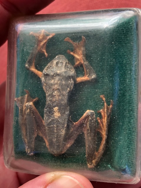 Hazel, however, disagrees. - Finally, Virginia produced a most amazing antique of a frog preserved. Given to her aged 10, in Australia. A calcified frot