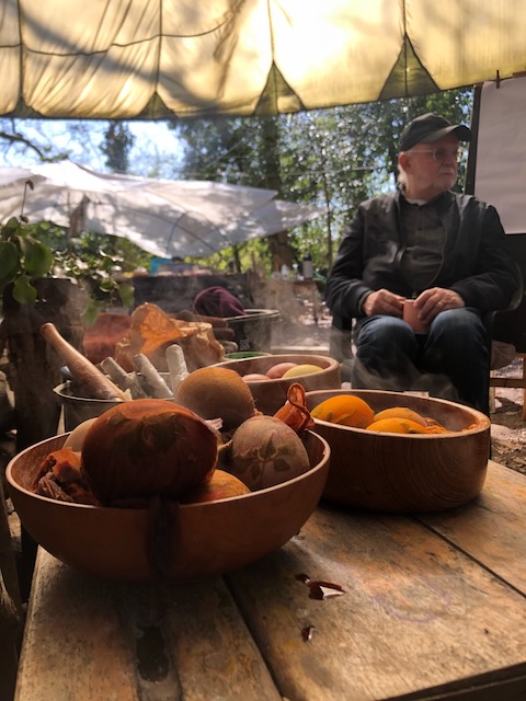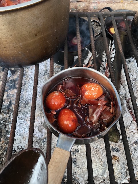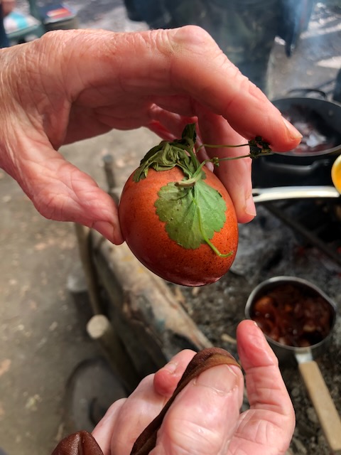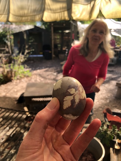 Some of us created beautiful eggs using wax or tights with plants creating patterns on eggs. Dyes used were red and white onion hibiscus, and turmeric. Tights used were ….(!)