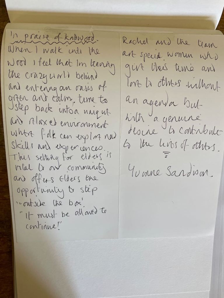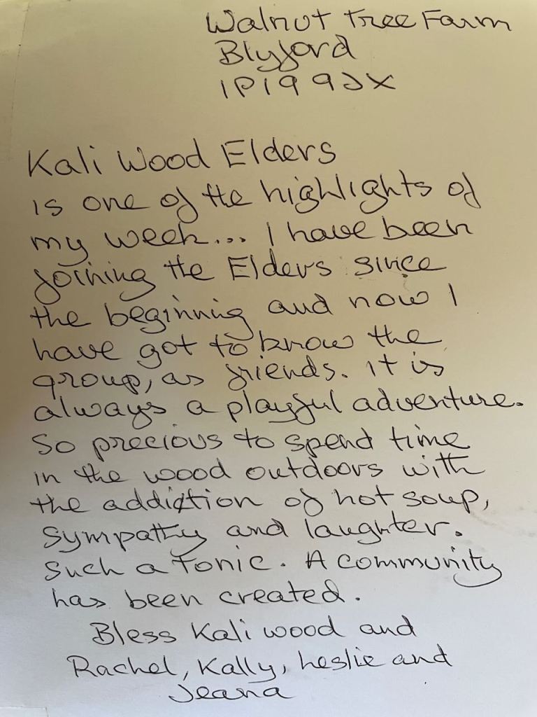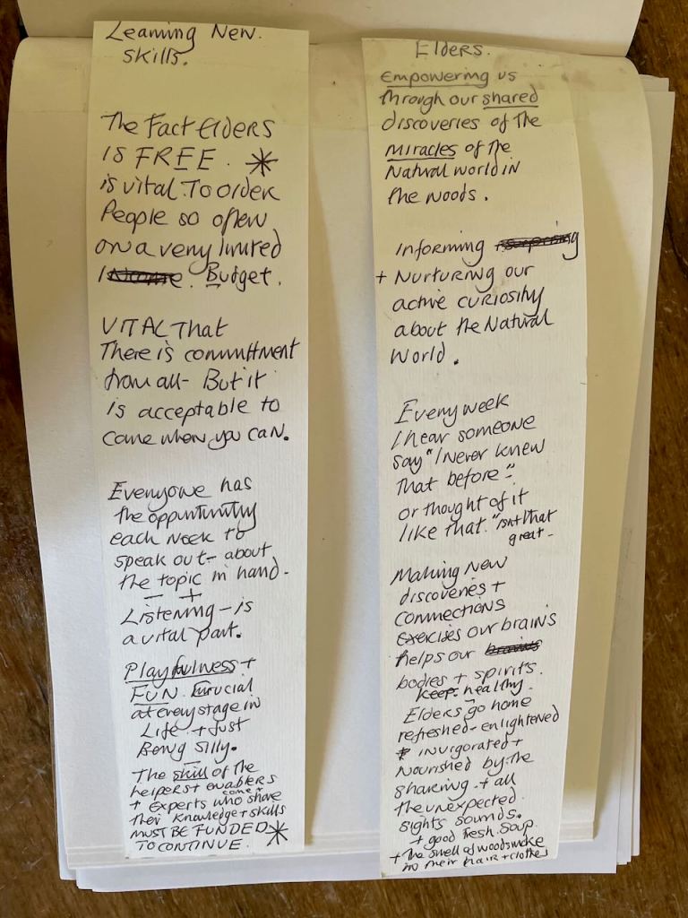 I was invited to join the Elders group by Rachel. I went a long and was so glad that I did. It felt quite magical to be sitting in the woods around the fire with the other people knowing that I was welcome there. I love trees and if felt good to be among them, allowing me to be calm and to think about things.