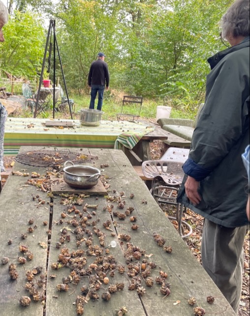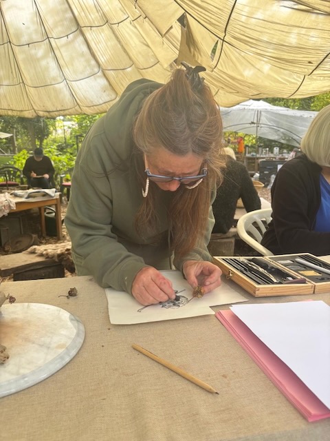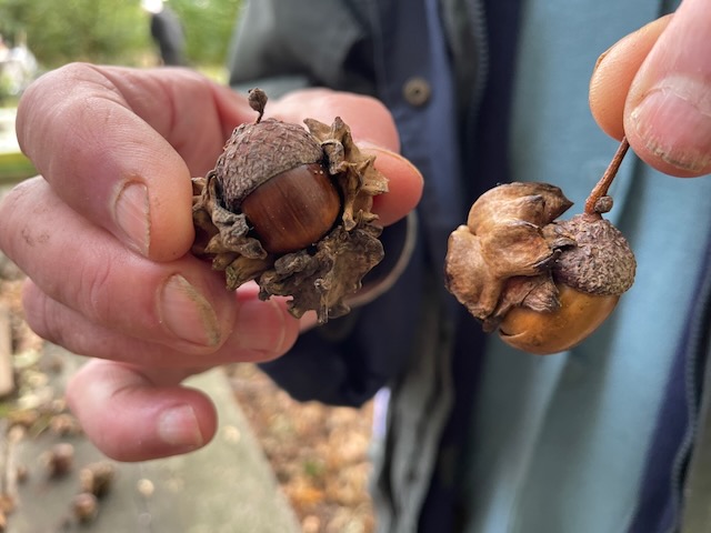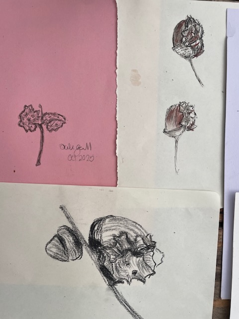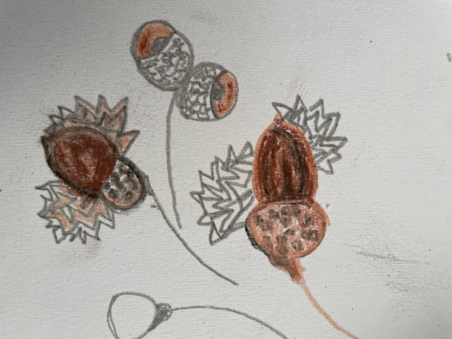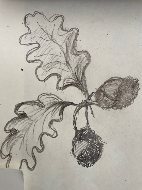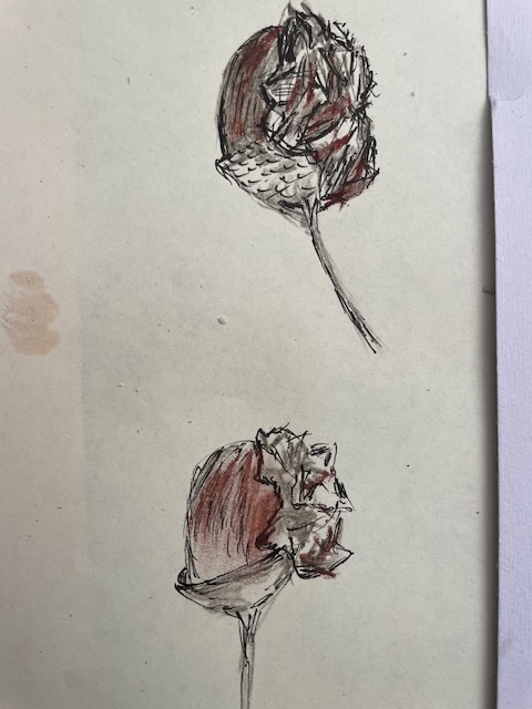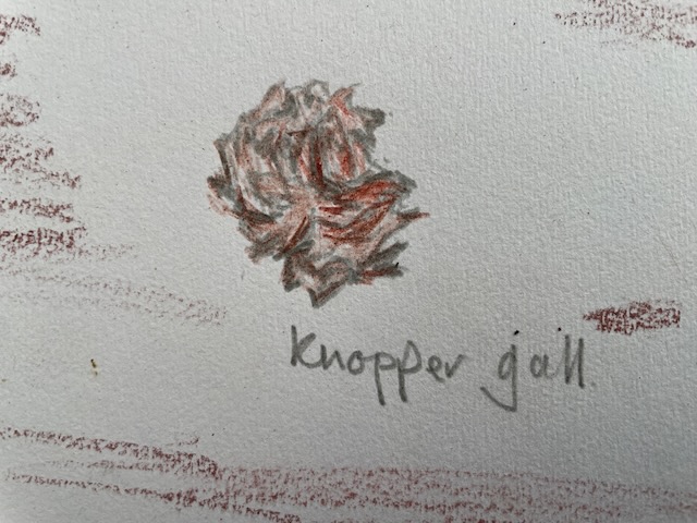 We went in search of galls, plentiful by the pond, where an English Pendunculate Oak meets a Turkish oak. From this (collective noun for many Galls) knobble of knopper galls we selected one, and came back to draw and explore this extraordinary shape, a chemical reaction.