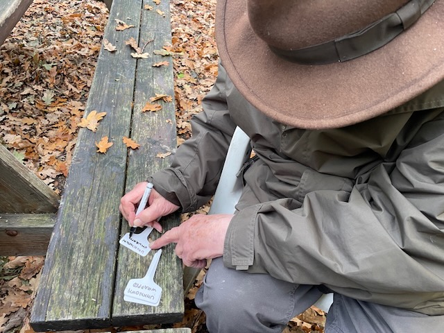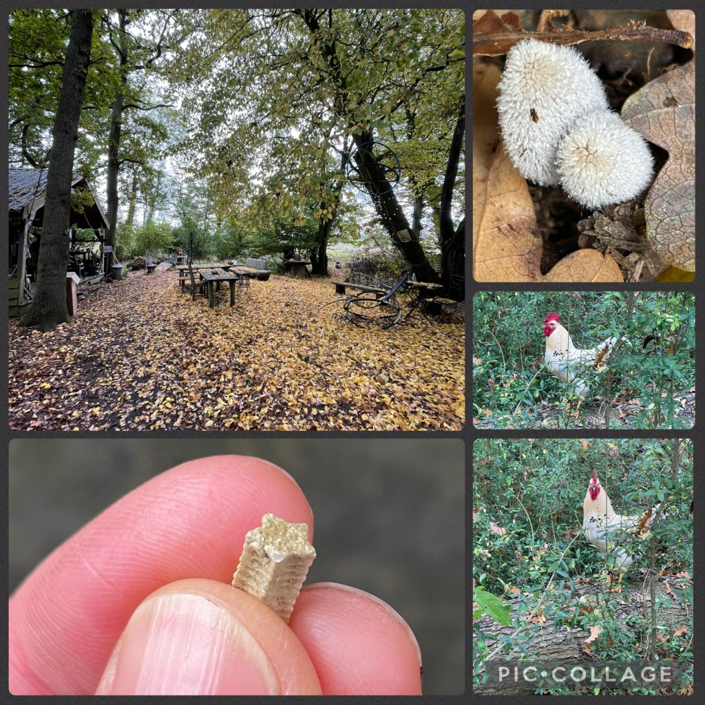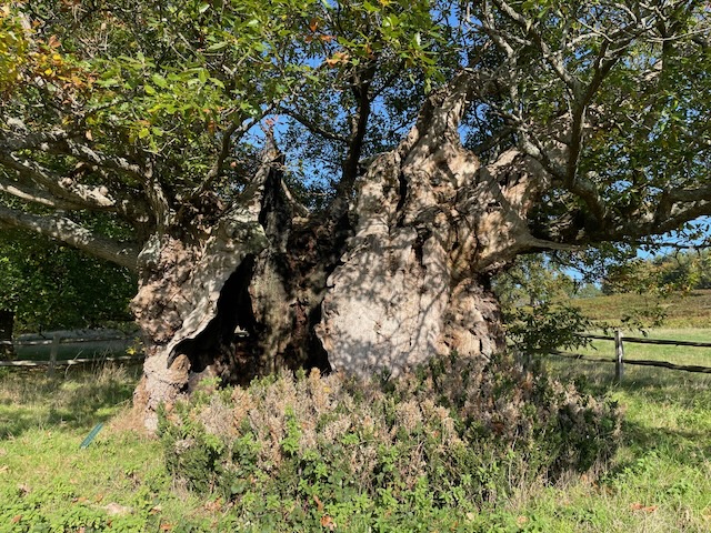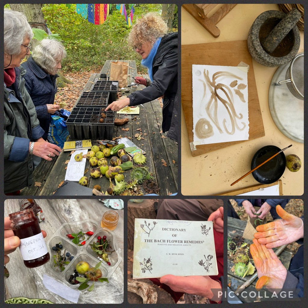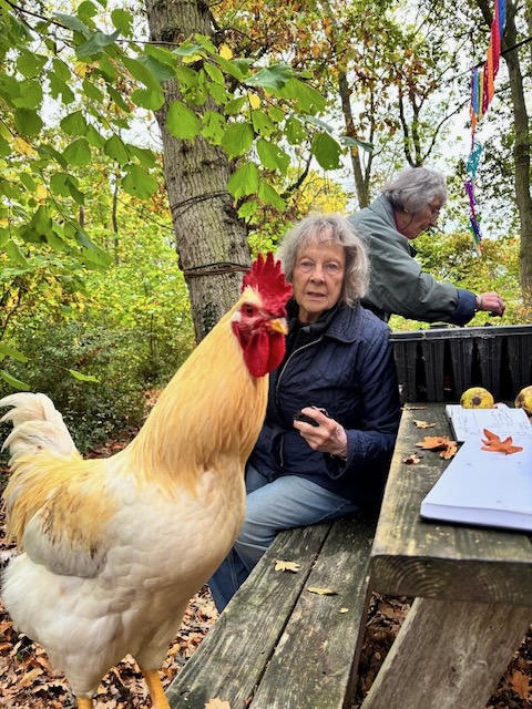 The Cowdary Oak, where Queen Elizabeth 1 once sheltered. Michael on labelling, Virginia on organisation, Rose-Ann on placement, Esther on black walnut dye, the cockerel keen to eat the seeds.