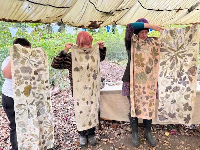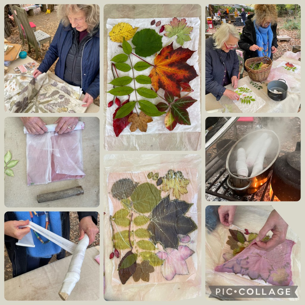 As a carpet of yellow ochre leaves fell beneath the Hornbeam, (and randomly someone arrived to see our Hornbeams), we worked around the fire, collecting and steaming leaves in mordanted cloth, and low what glorious result! See images below.