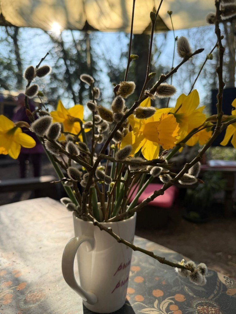 We could not have wished for a more glorious spring day. After lunch of the last of last years potatoes from our community alotment (before we planted some more), we gathered in our circle and said what we noticed had changed: