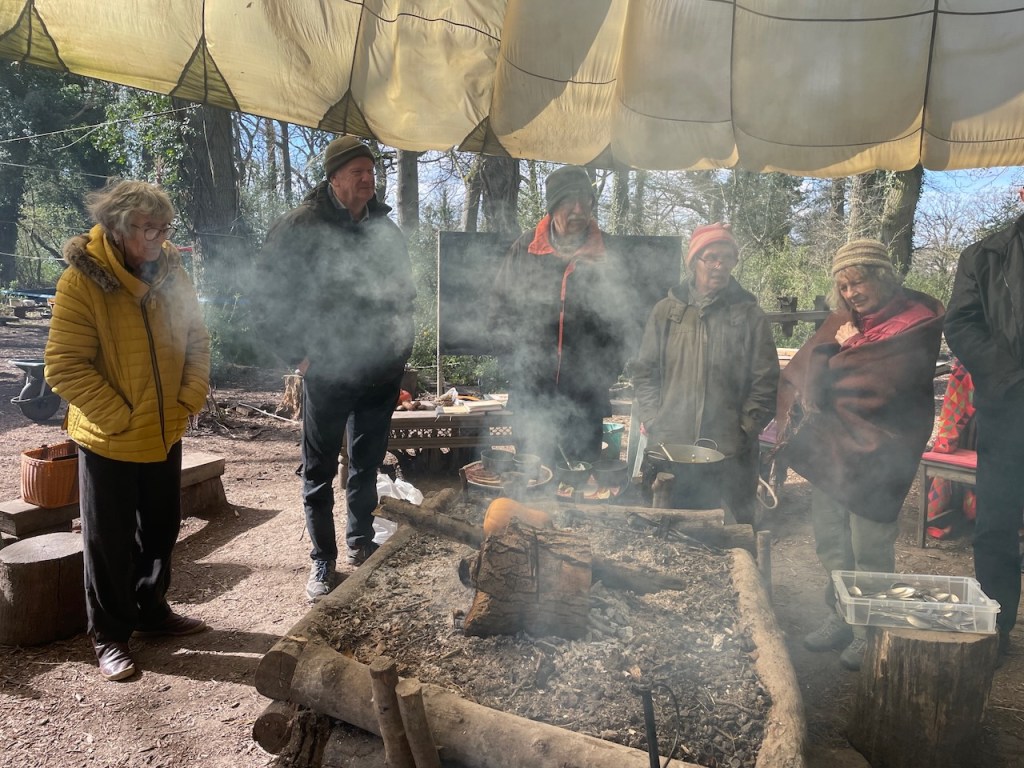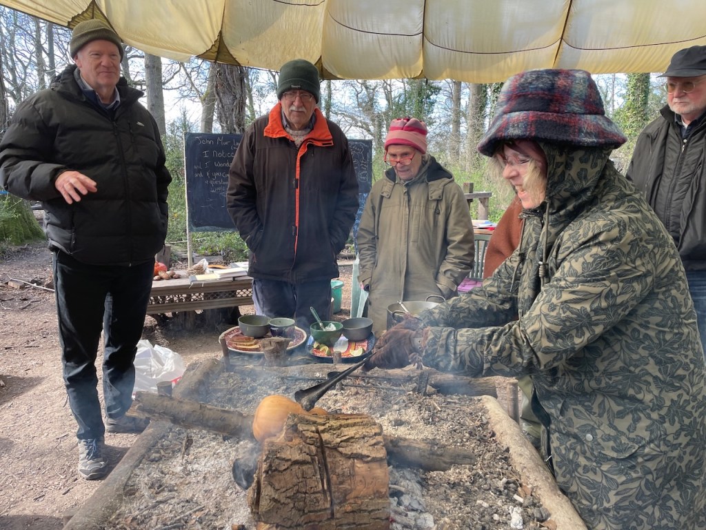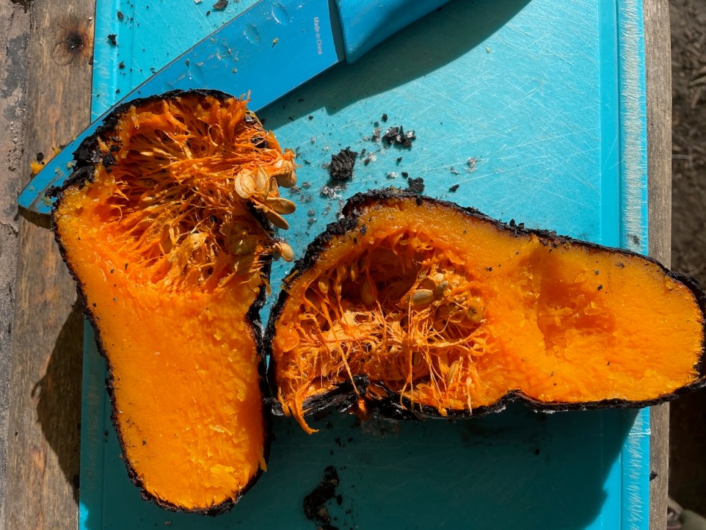 Turns out that not only Butternut squash is an immigrant but all squash come from another land, mainly South America. (Squash (genus Cucurbita) originated in the Americas, with the earliest domestication occurring in Mexico around 8,000–10,000 years ago.) But we should welcome all these immigrants and not turn our noses up at Butternut which has a huge shelf life. Rose-Anne told of us of one she kept in france in a box of straw for over a year. So as if honour the butternut, Andrew placed the one he held on to the fire, and we watched it cook.