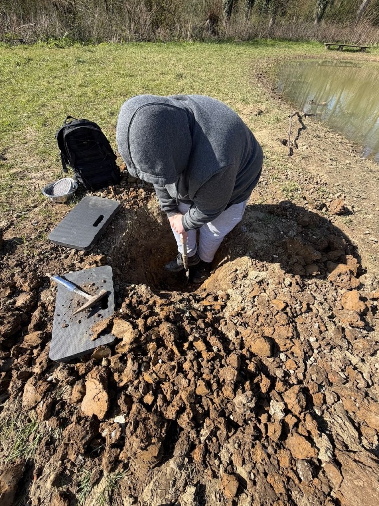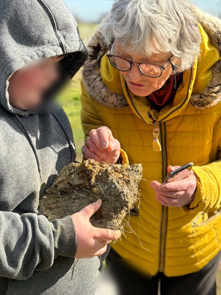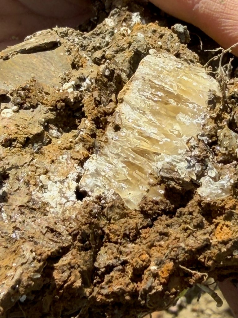 Meanwhile Greg found a seam of crystals. He’d dug down nearly a meter. (helped by Gina) to find this geology. Virginia found a part which looked like it was growing a crystal.