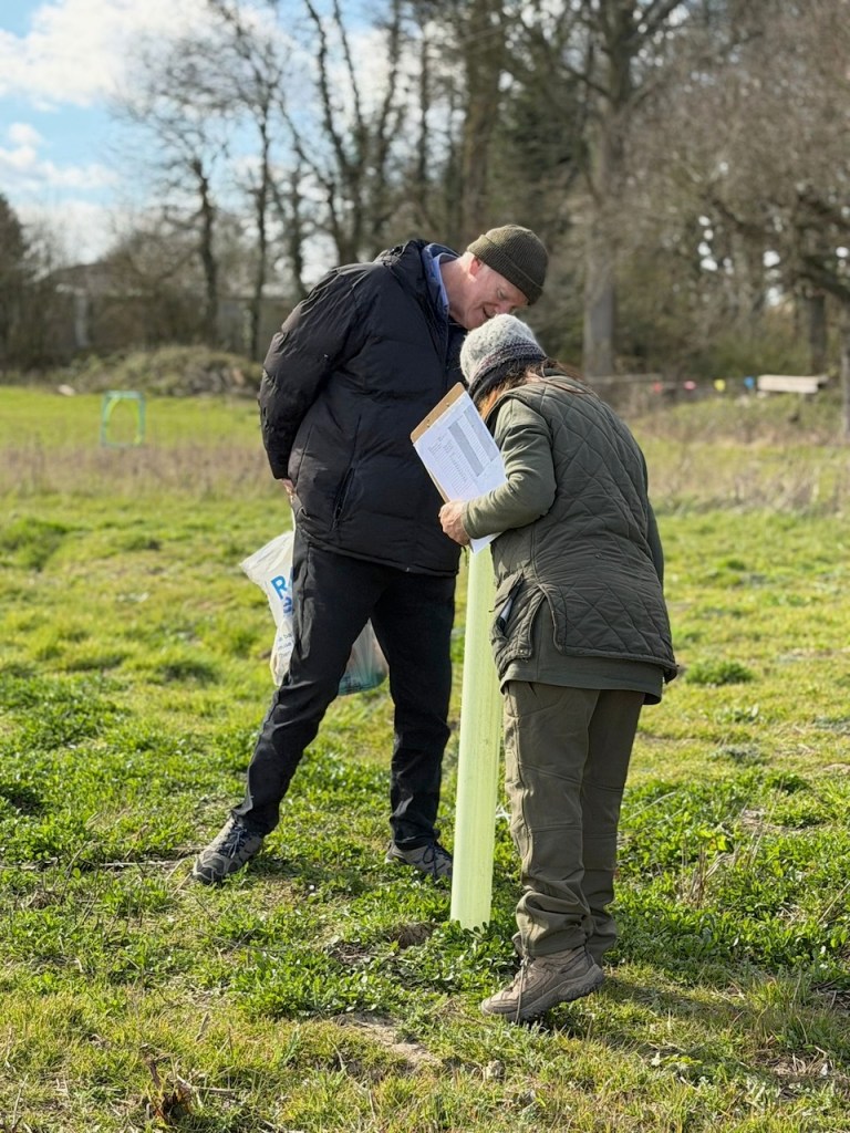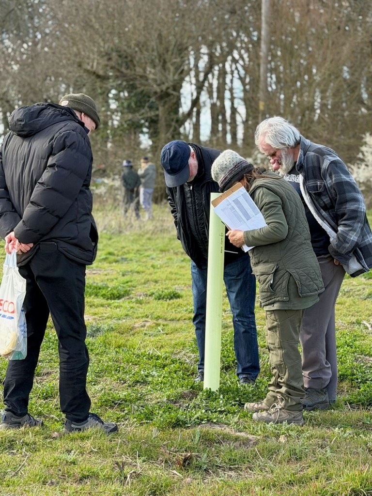 We needed to move, and so came out to the sun, to measure the trees we had first measured in March last year, when they were planted. Only one tree had exceeded our last measurement in June last year. Lots of looking down tubes.