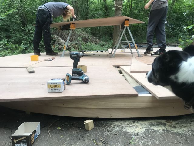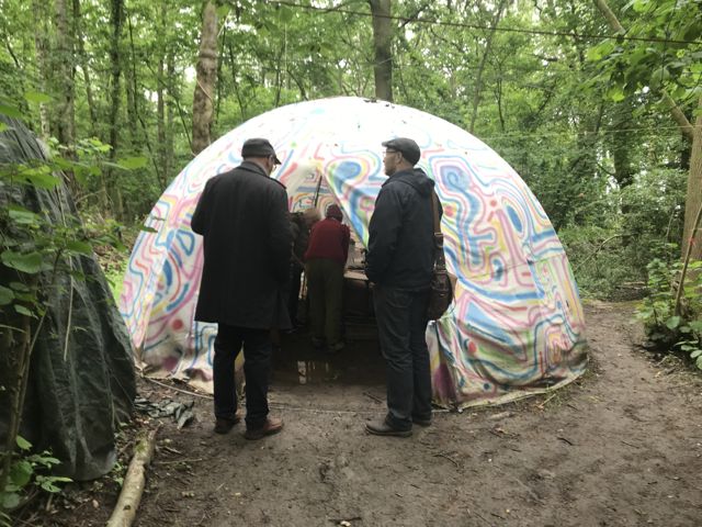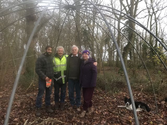 The old wedding dome was donated to us by Graham, who was clearing out all that was not necessary in his life before he left it. He came to lunch at the cabin, the cabin he built with Paul, as a last lunch, and gave it then. Here is a photo of him, Paul, Adel and Jo, underneath it’s scaffold December 2019. He died a few months later.