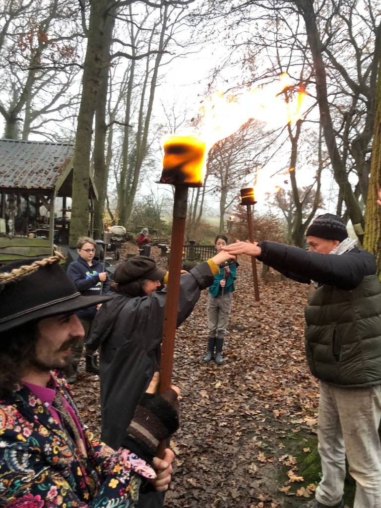 A fire procession around the wood in gathering dusk and soft mist, led by Theo took us to the cabin around the fire and under a human archway, back to our circle. Here we wrote on paper our reflections on the year, and burnt them in the flame. Some said them to be heard, others kept them to the flame.