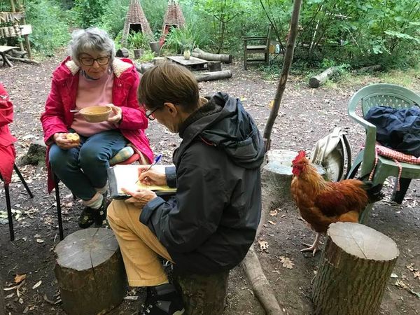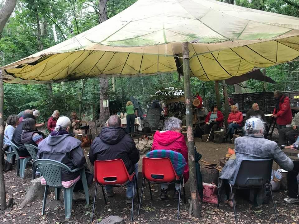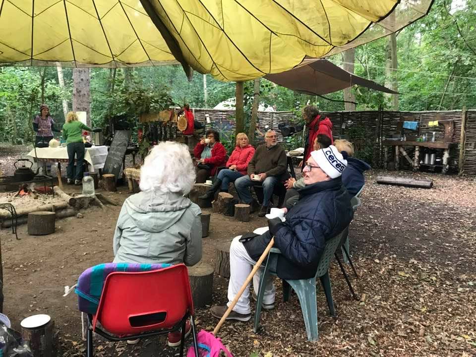 September 30th – we met, Autumn upon us, but it did not rain, Prince Charles (the woods resident rooster) gave us welcome and hovered around, as we met in our circle, and introduced ourselves. Kevin from the Pear Tree came for a fleeting visit and saw some of the folk he’d found for us arriving.