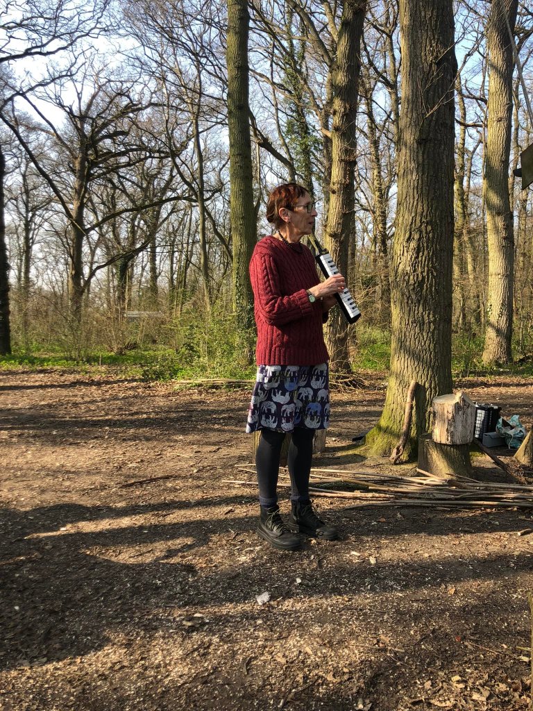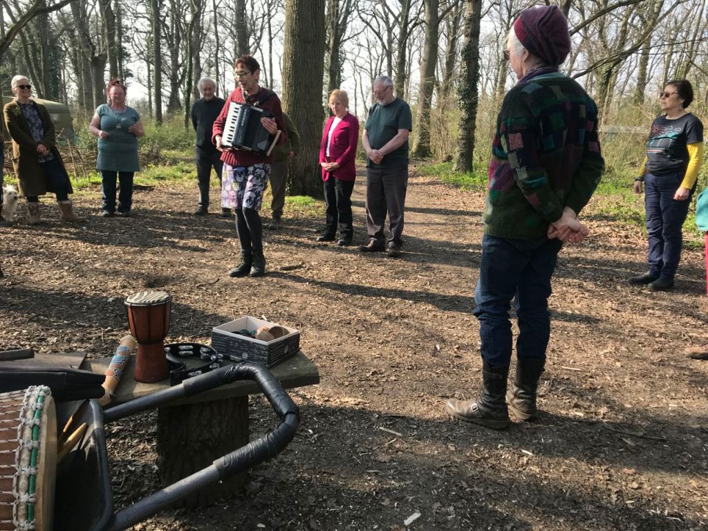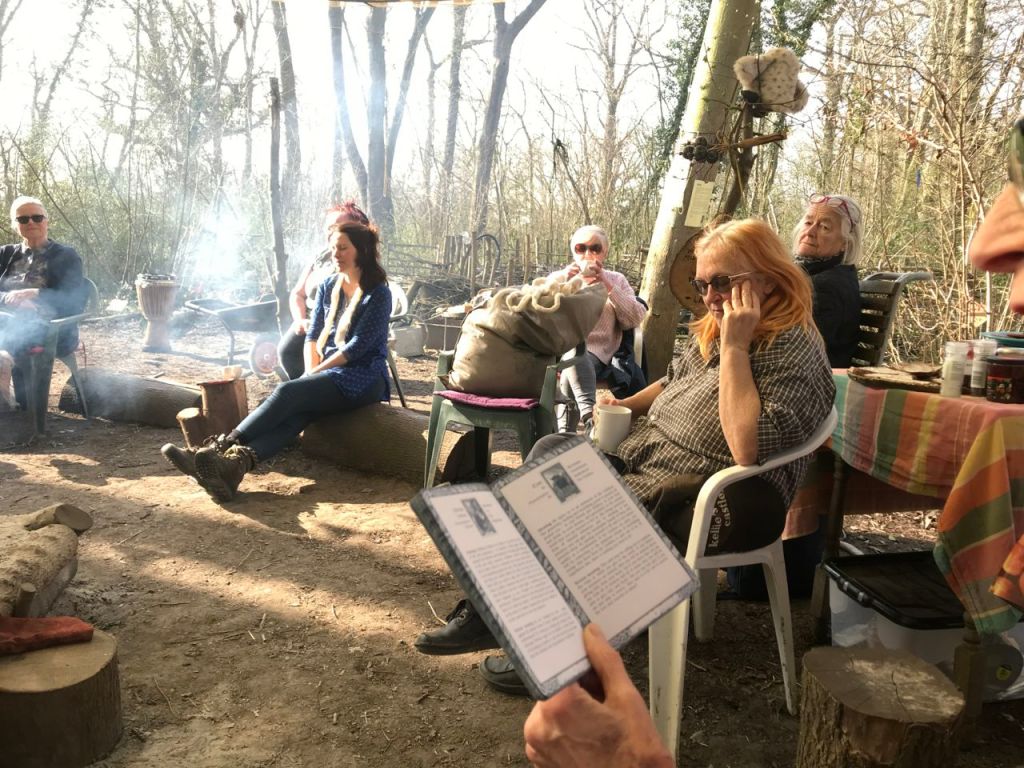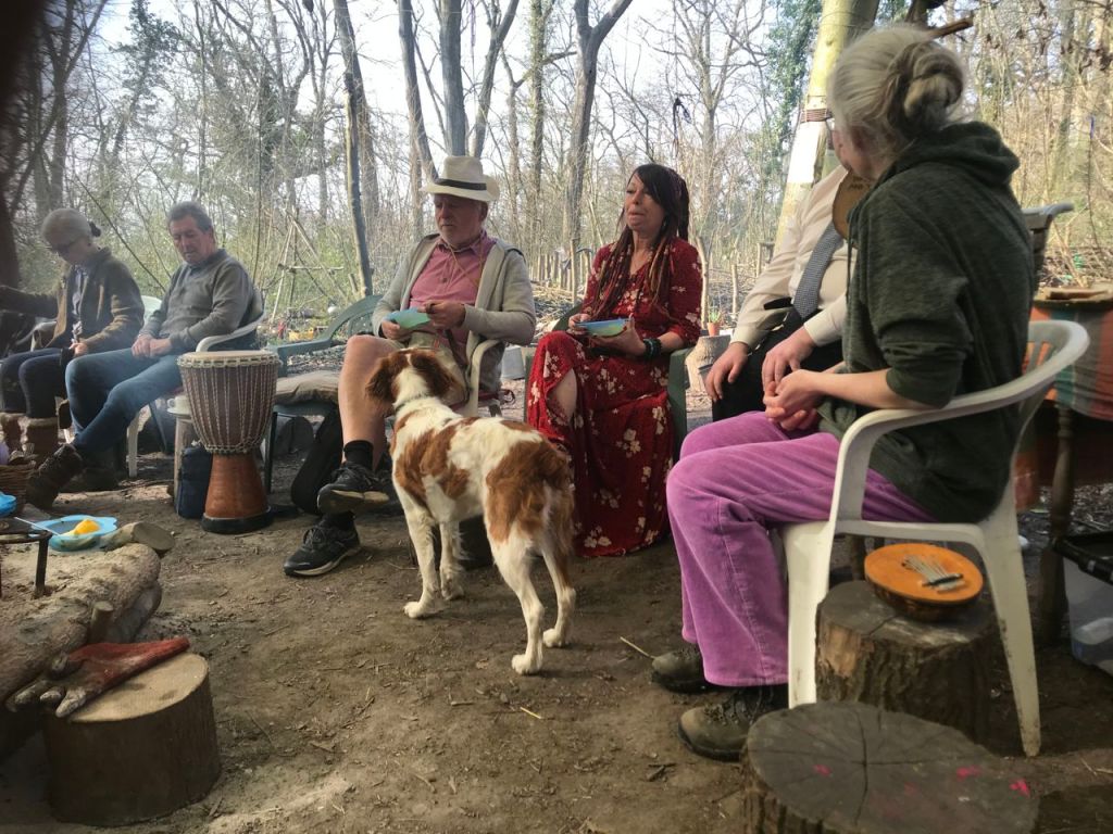 After listening to the spring sounds around us, we made our imitation or observation: peoples breath, a dog bark, a pheasant, buzzing bee, laughter in the circle, the singing bowl. Do you hear the nightingale in your garden? one asked.